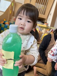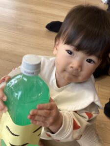 もらったジュースにオニを貼り付けたRくん