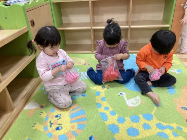 自分で選んだ色のお花紙を袋にいれてるね