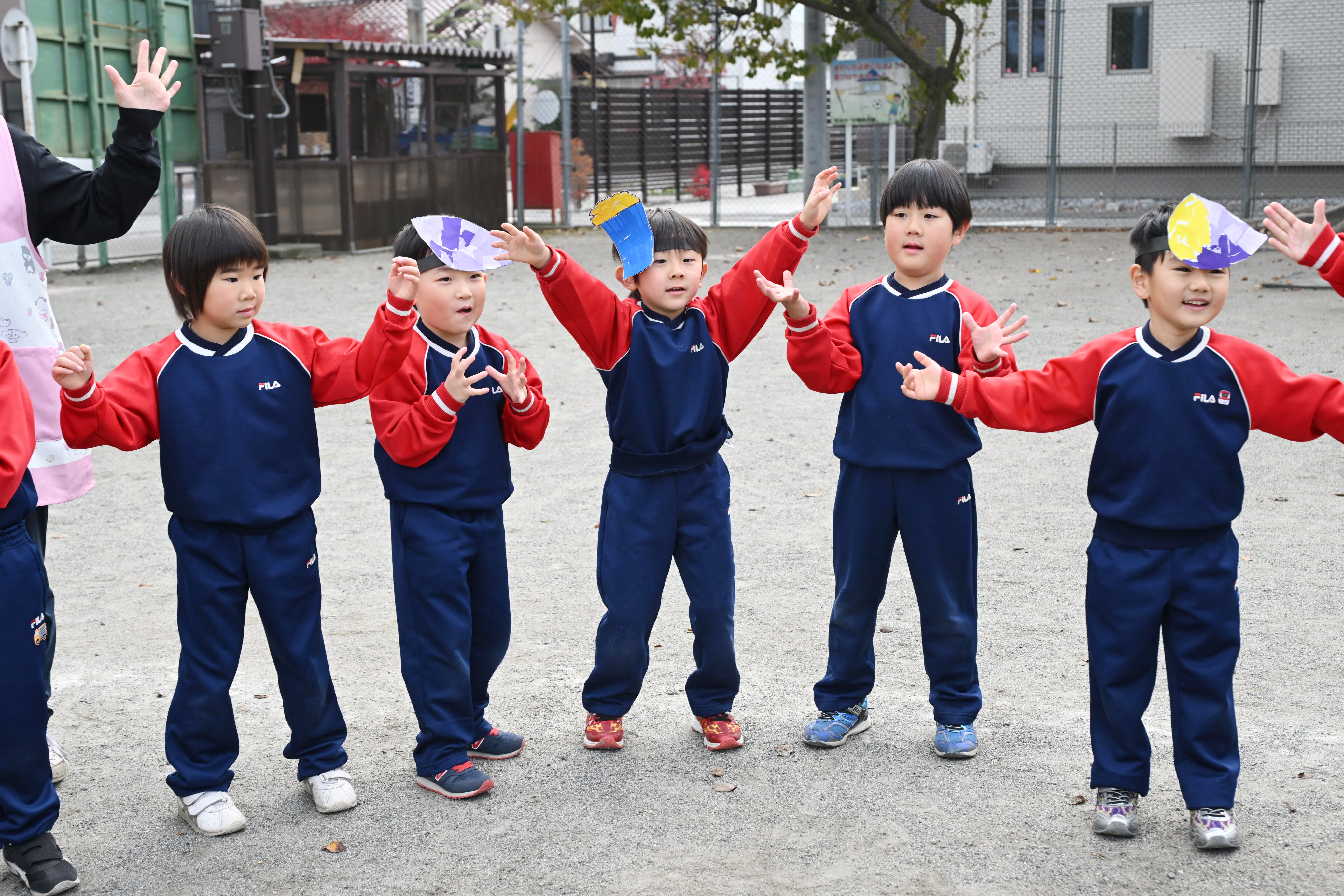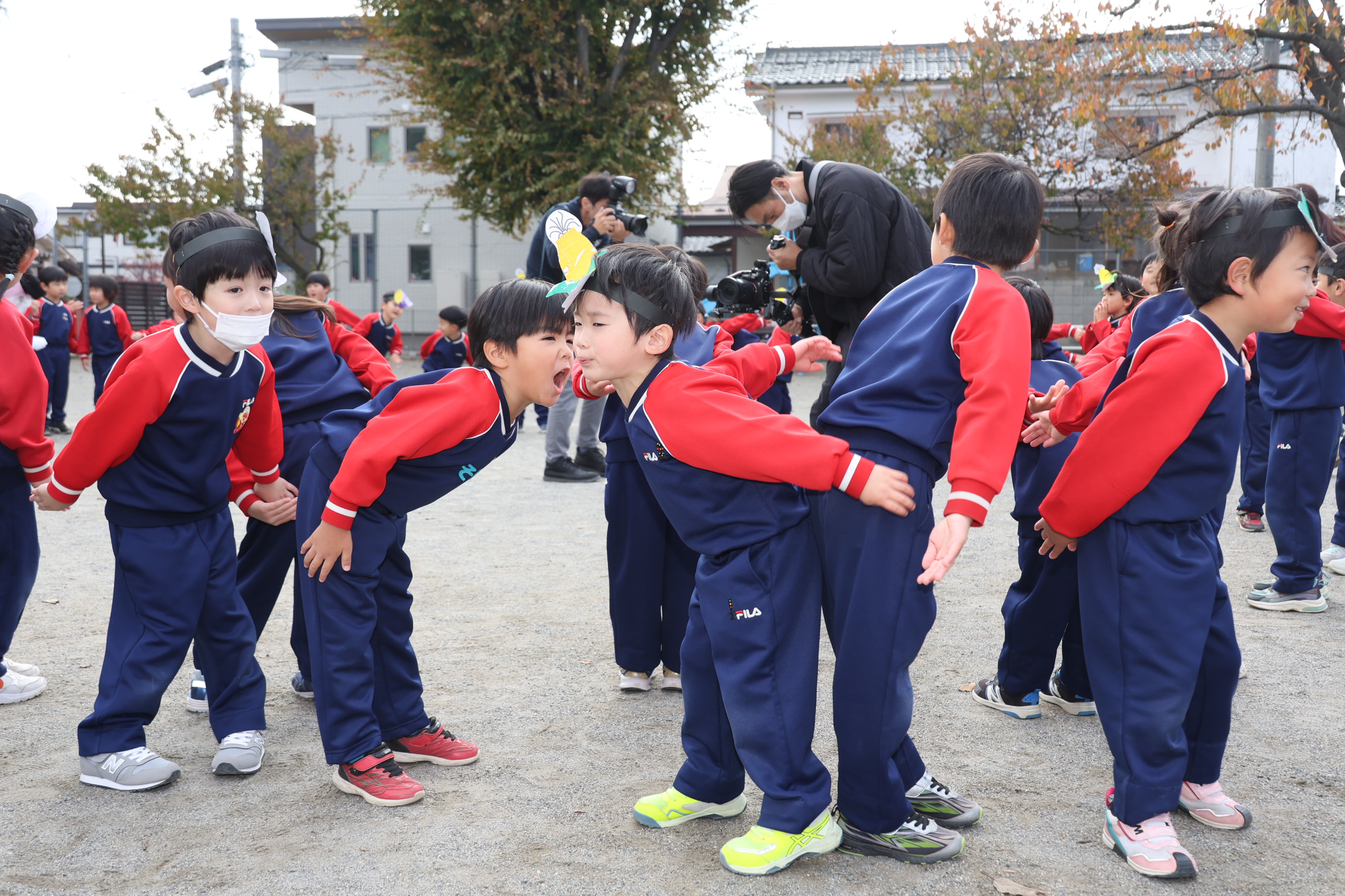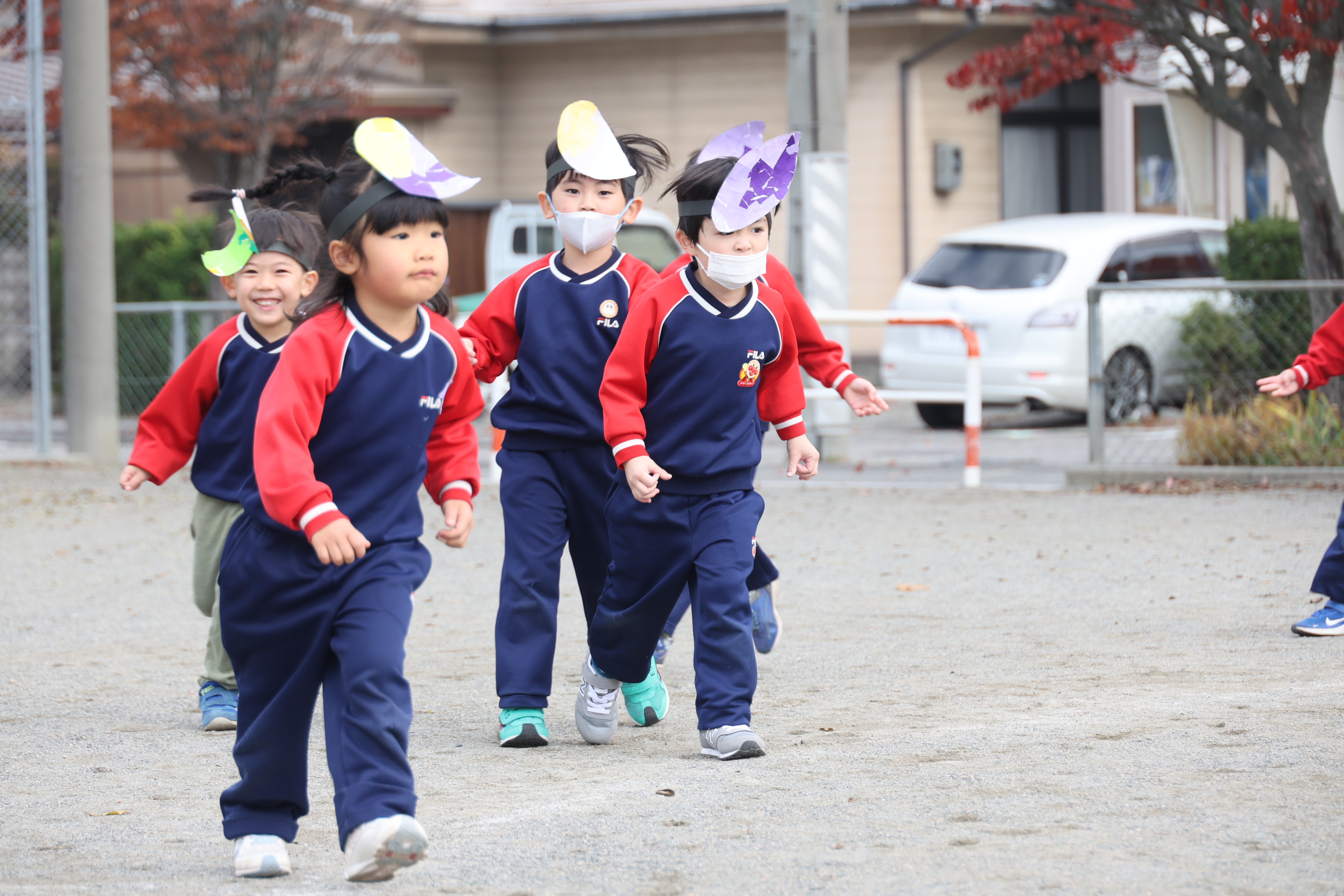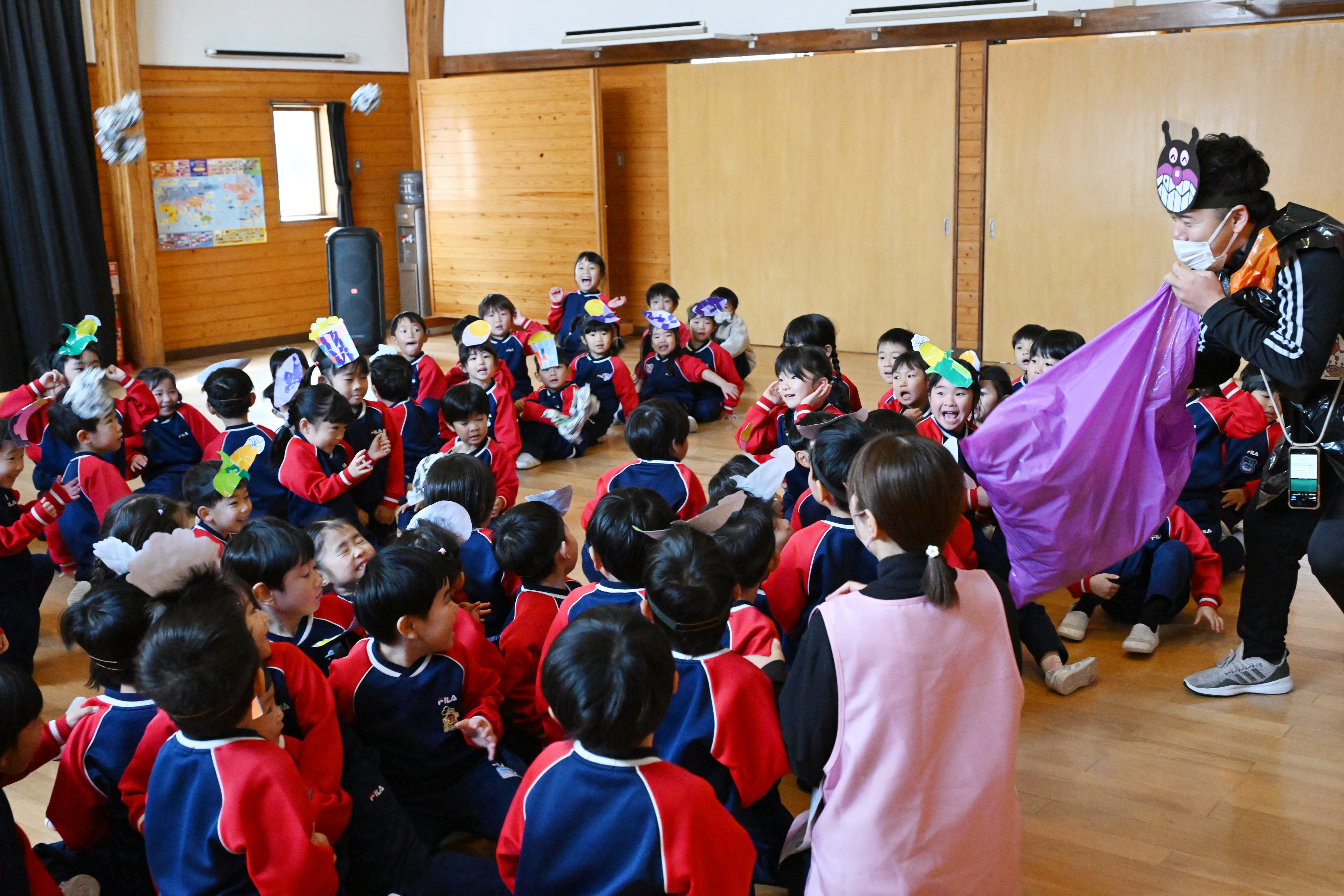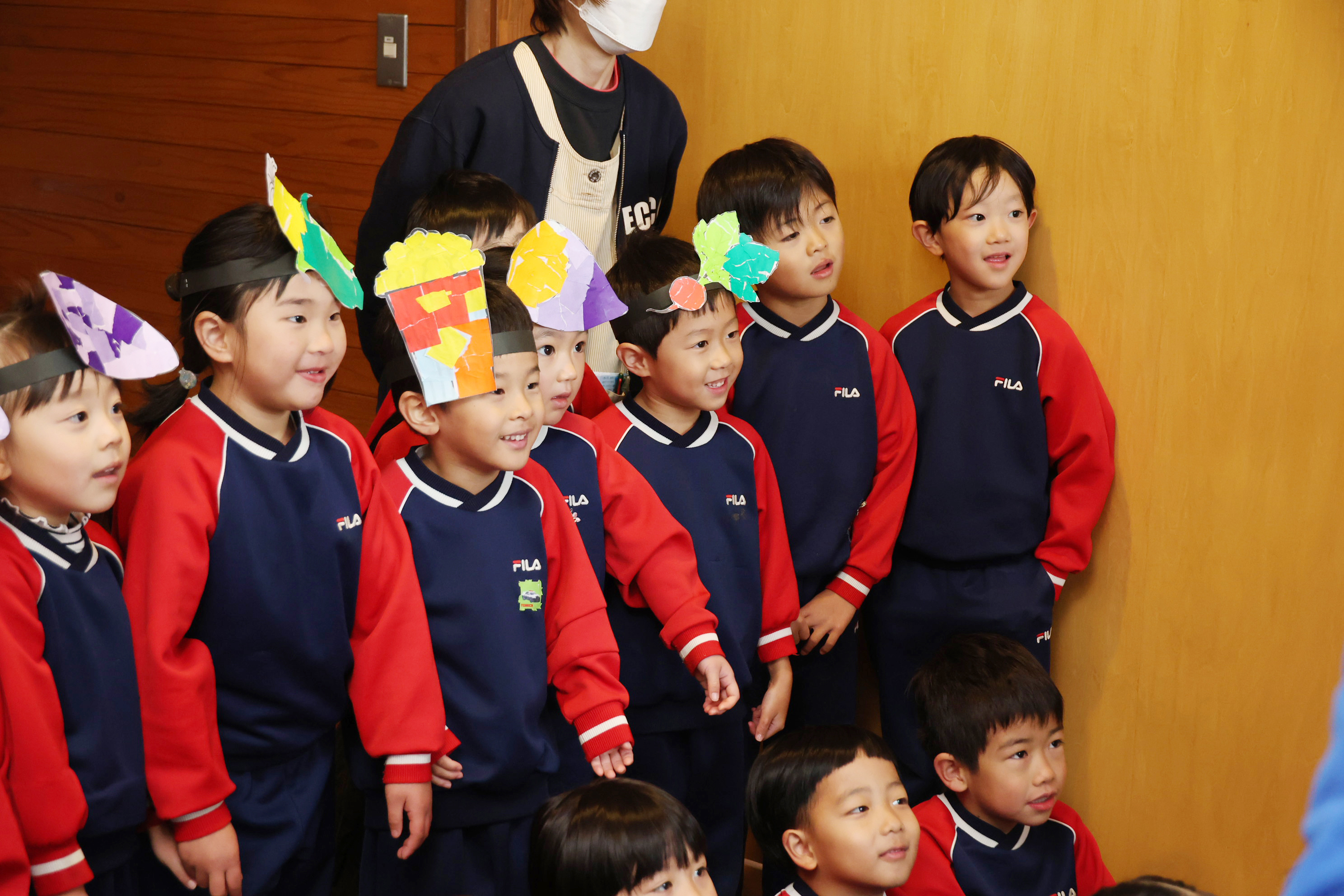 野菜やおにぎりのお面をつけて