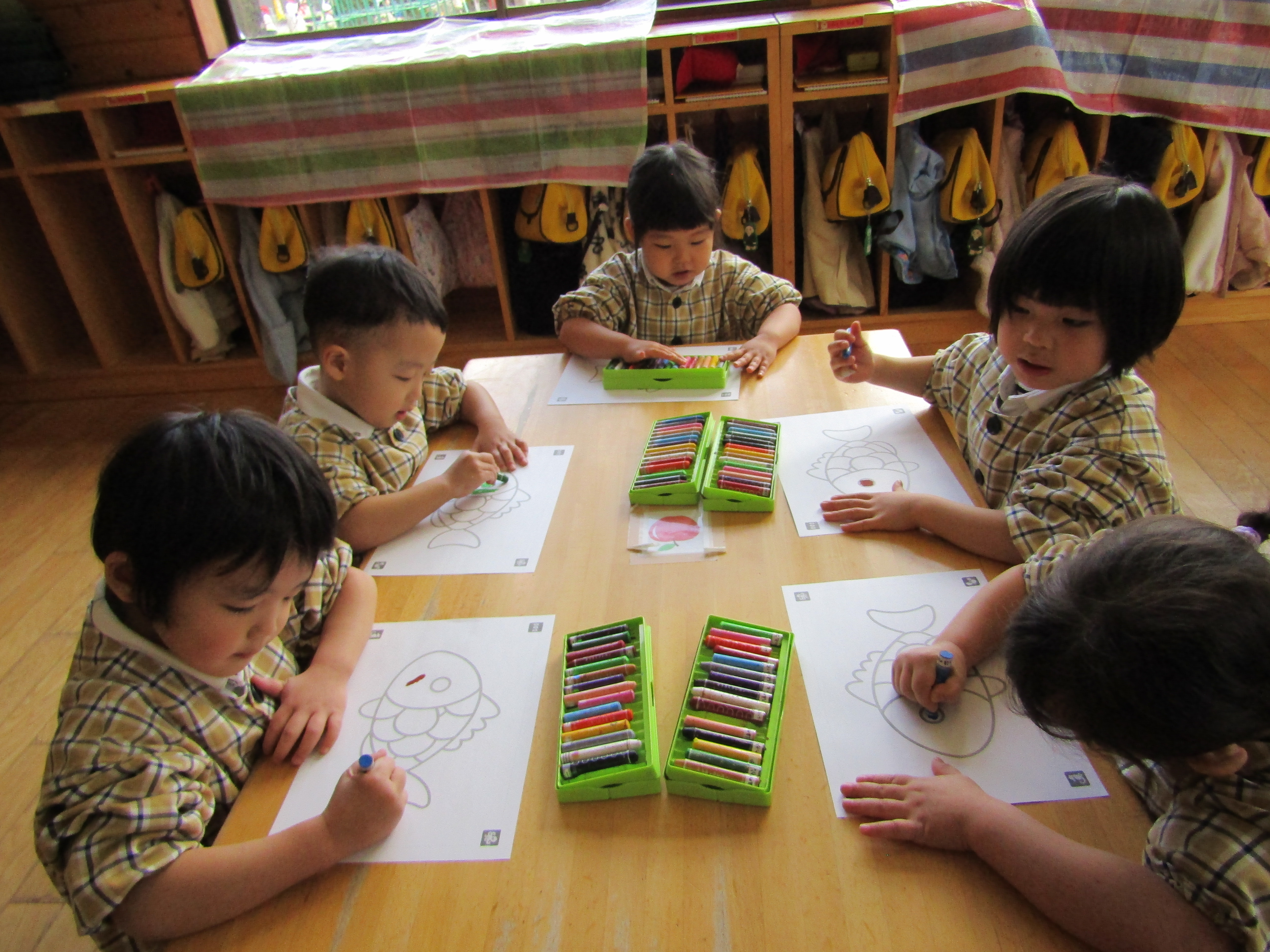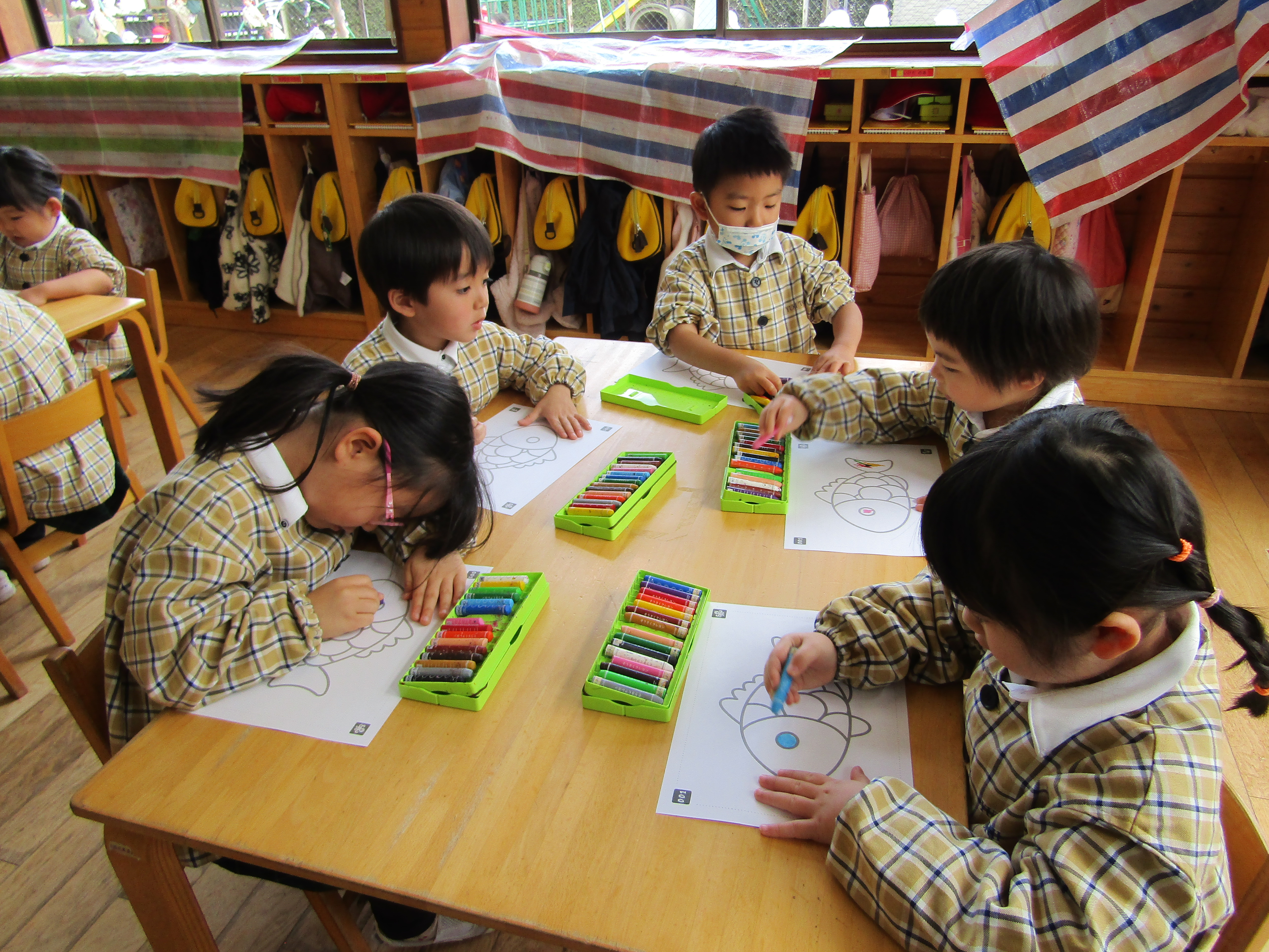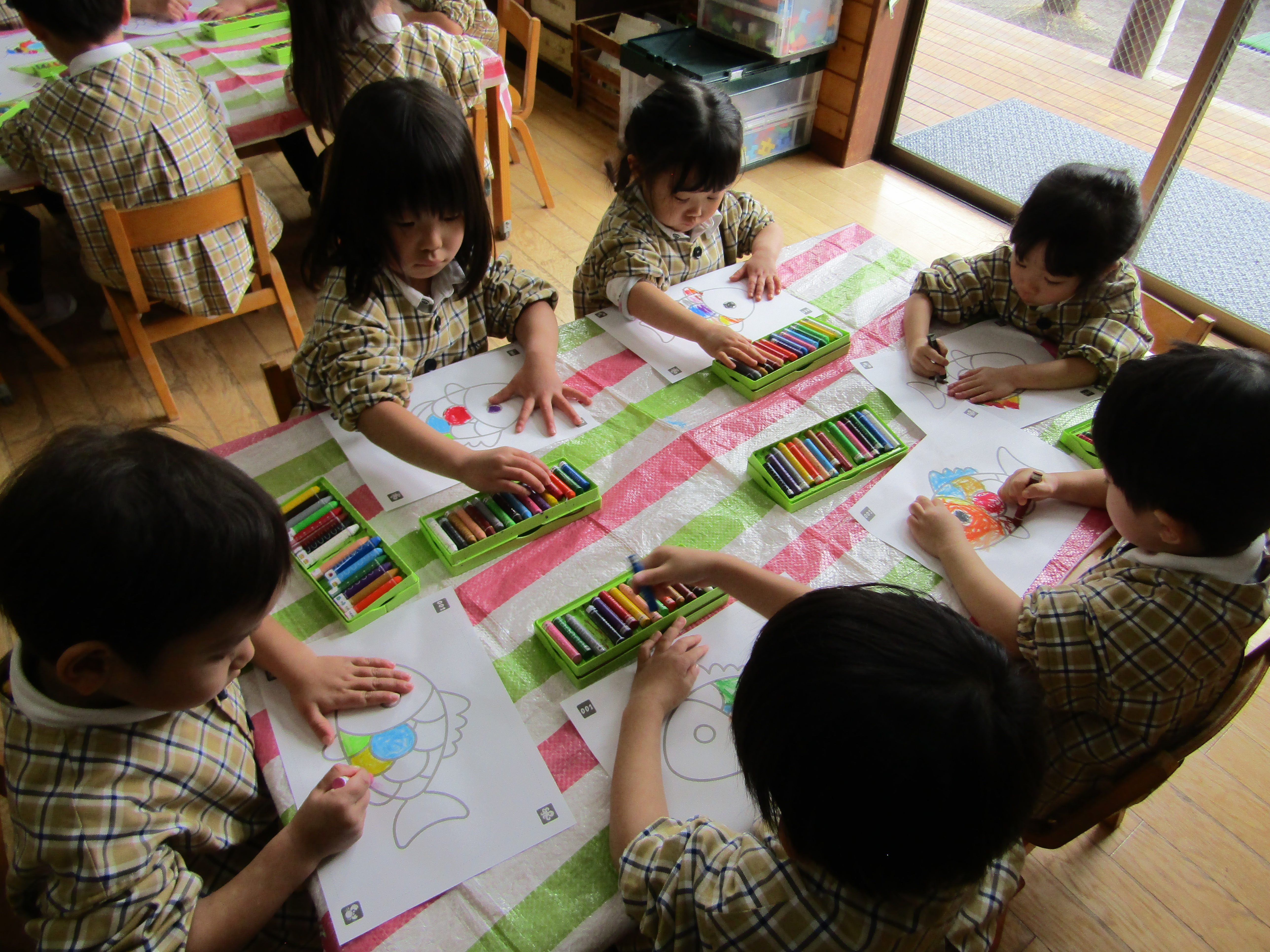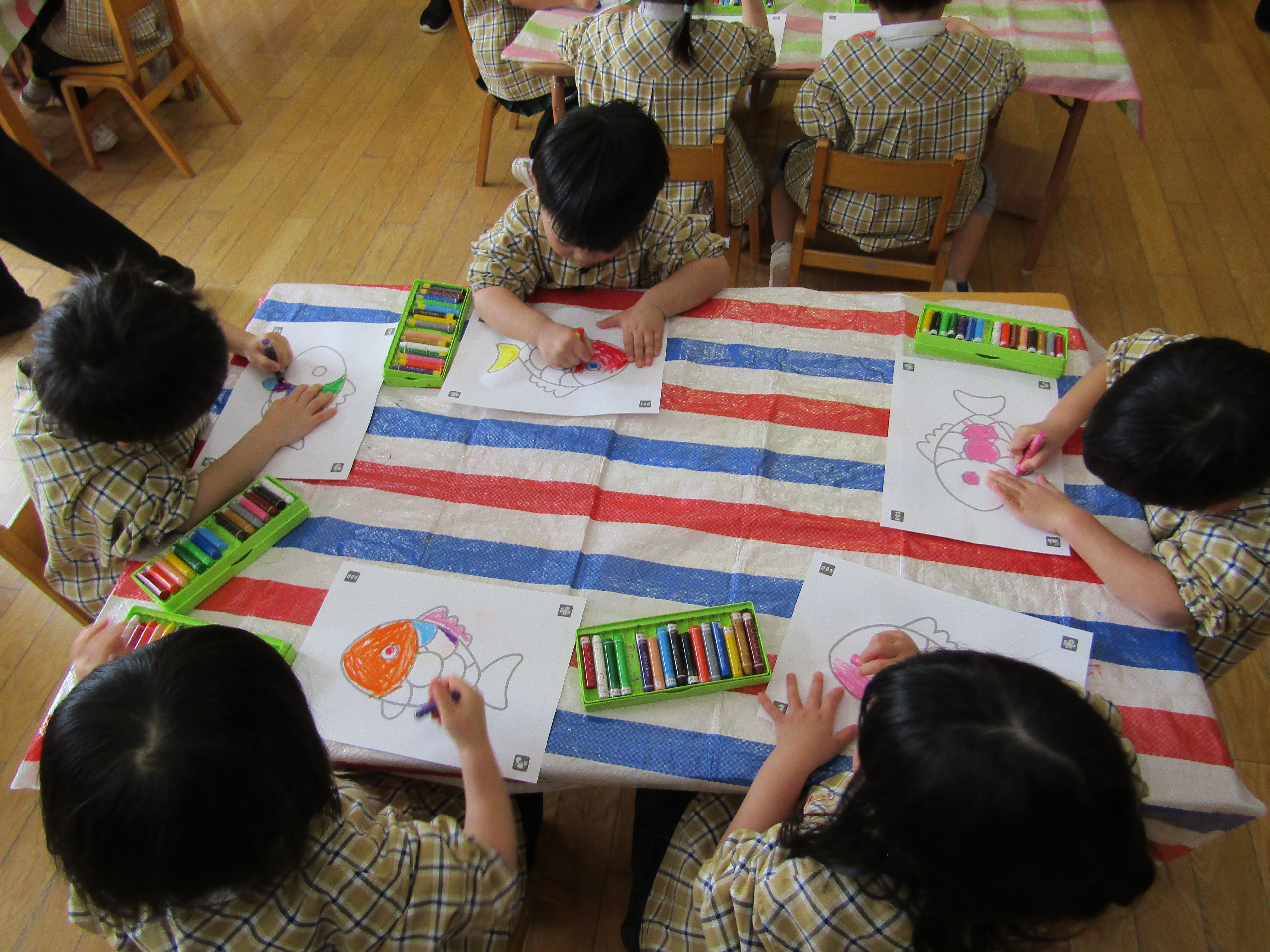 お魚の絵に色を塗っているつぼみさん達!