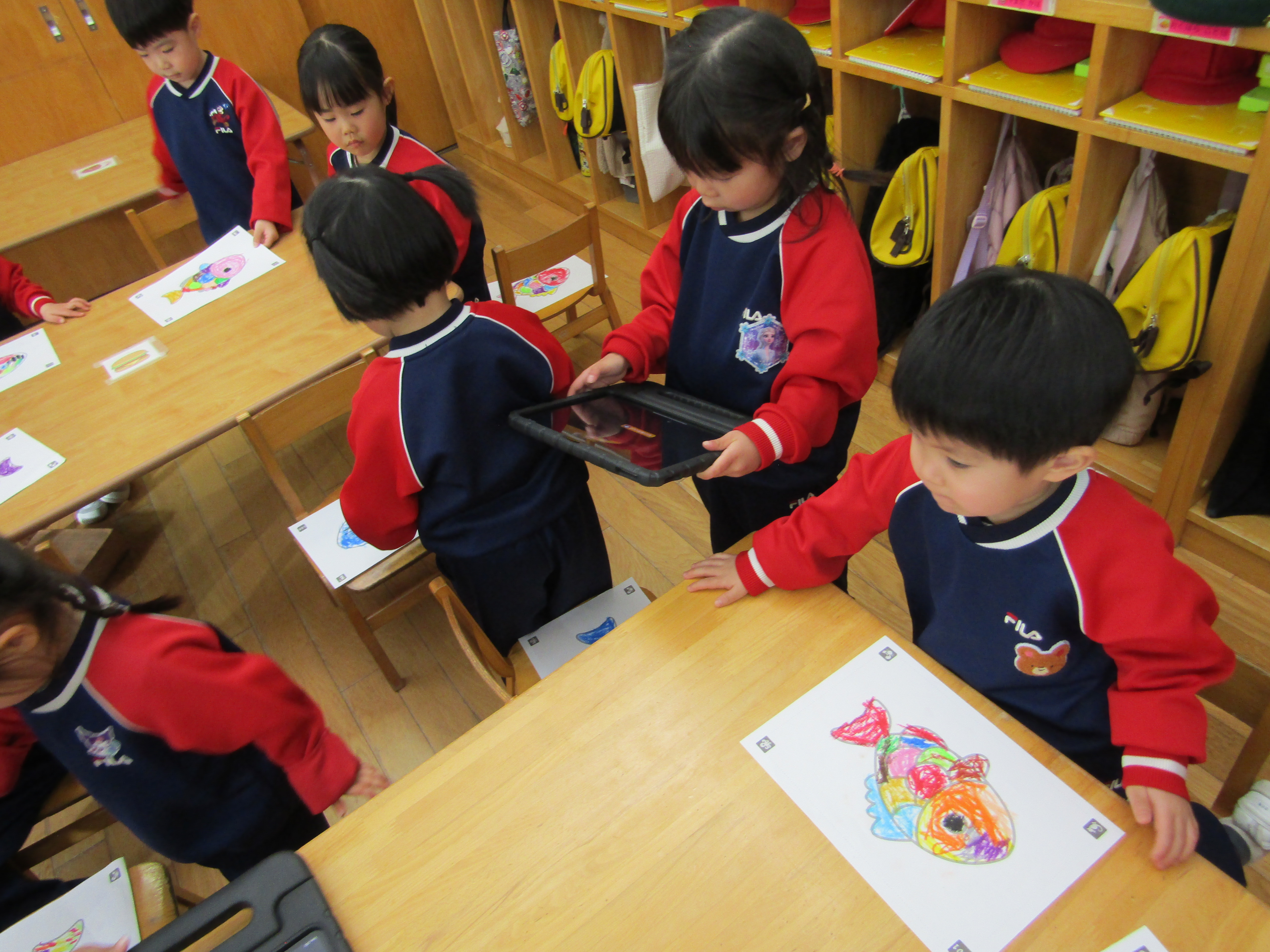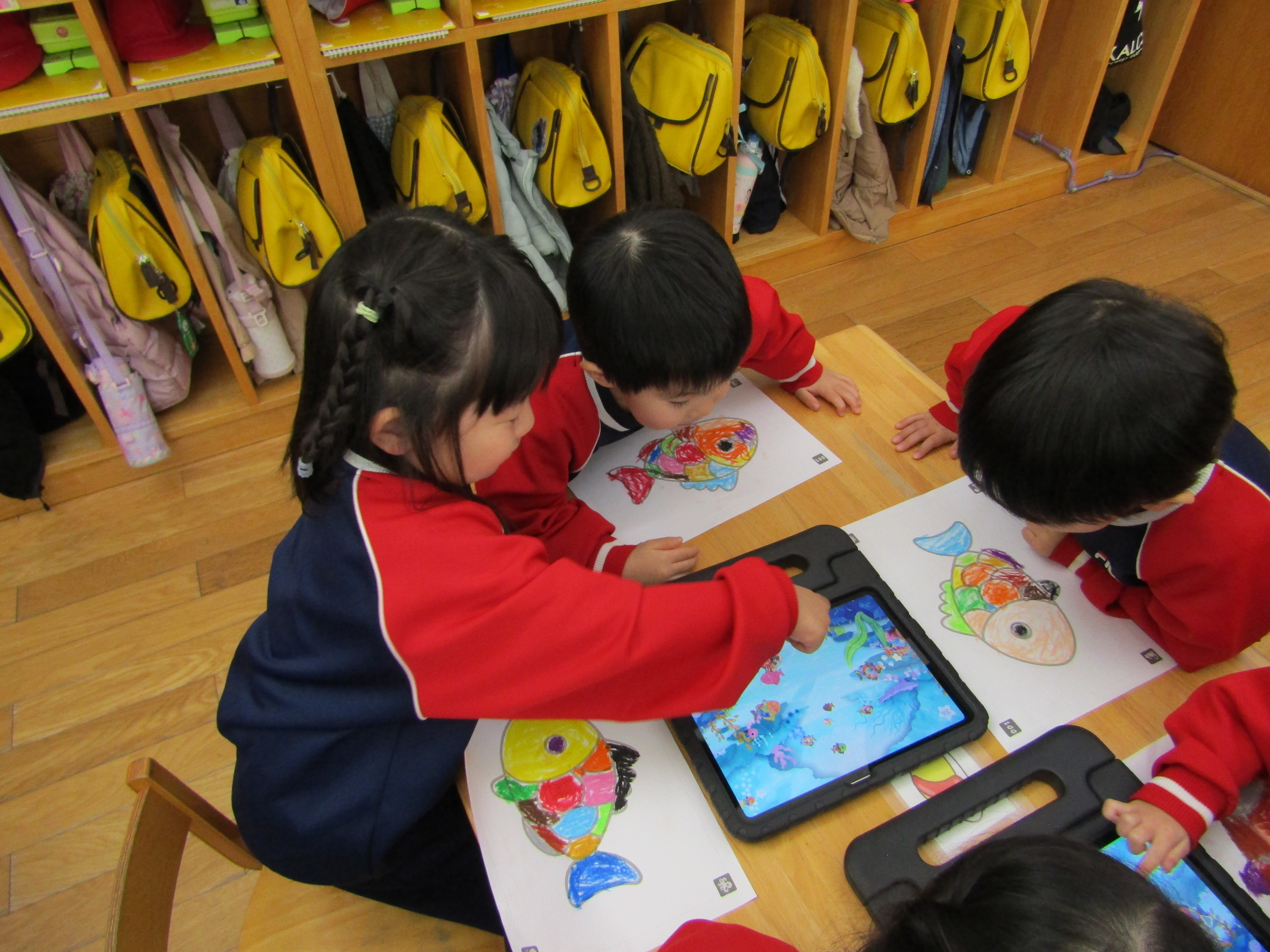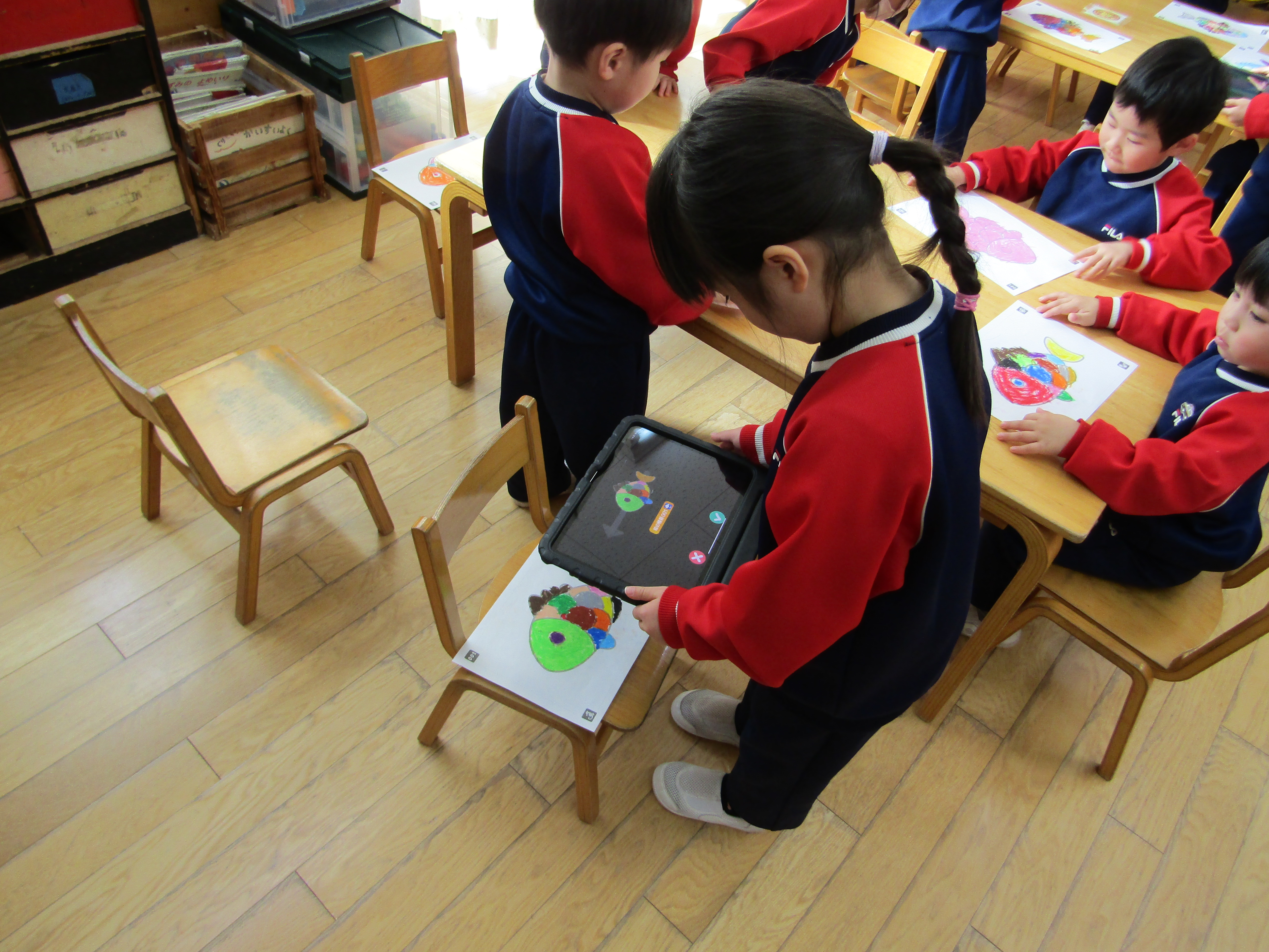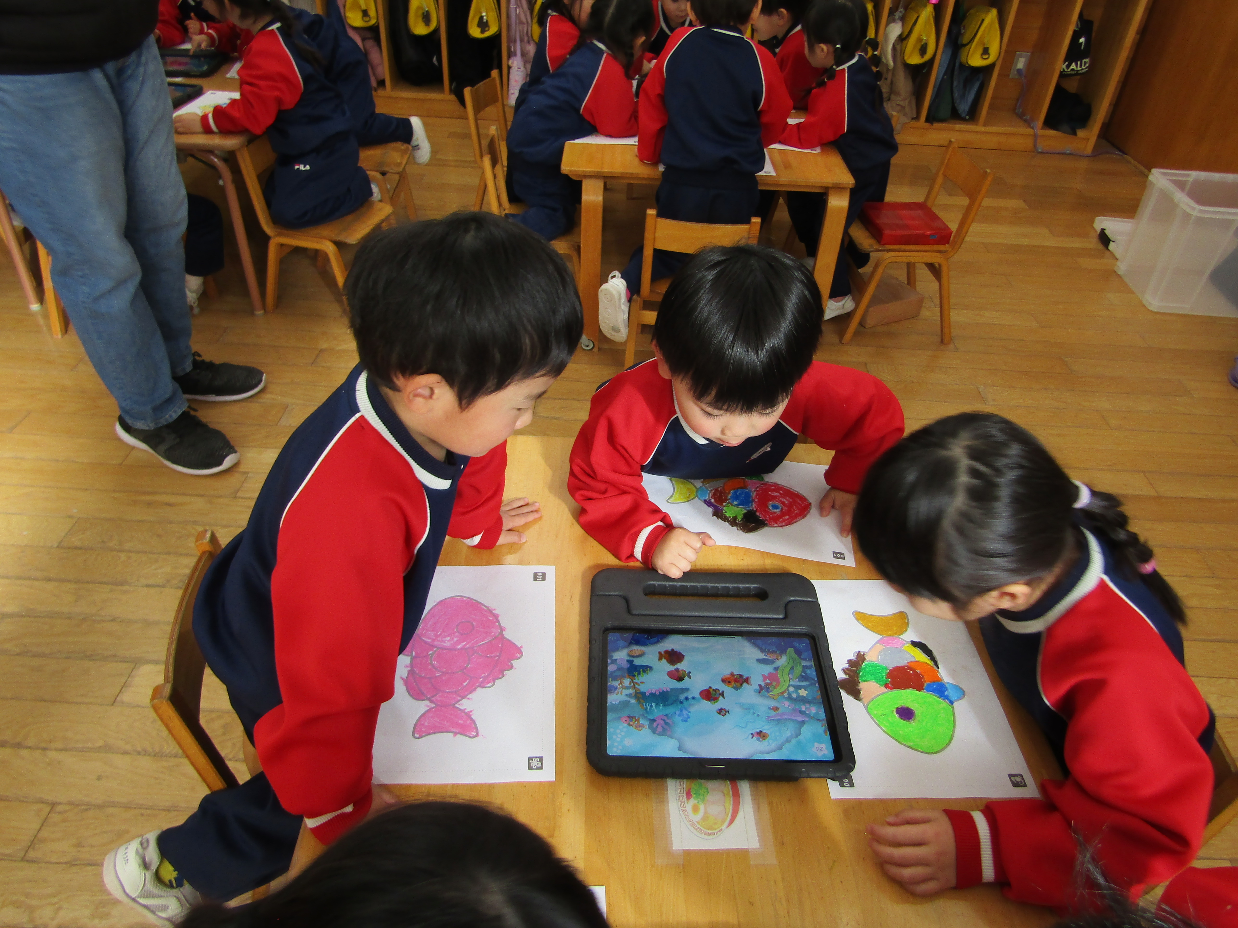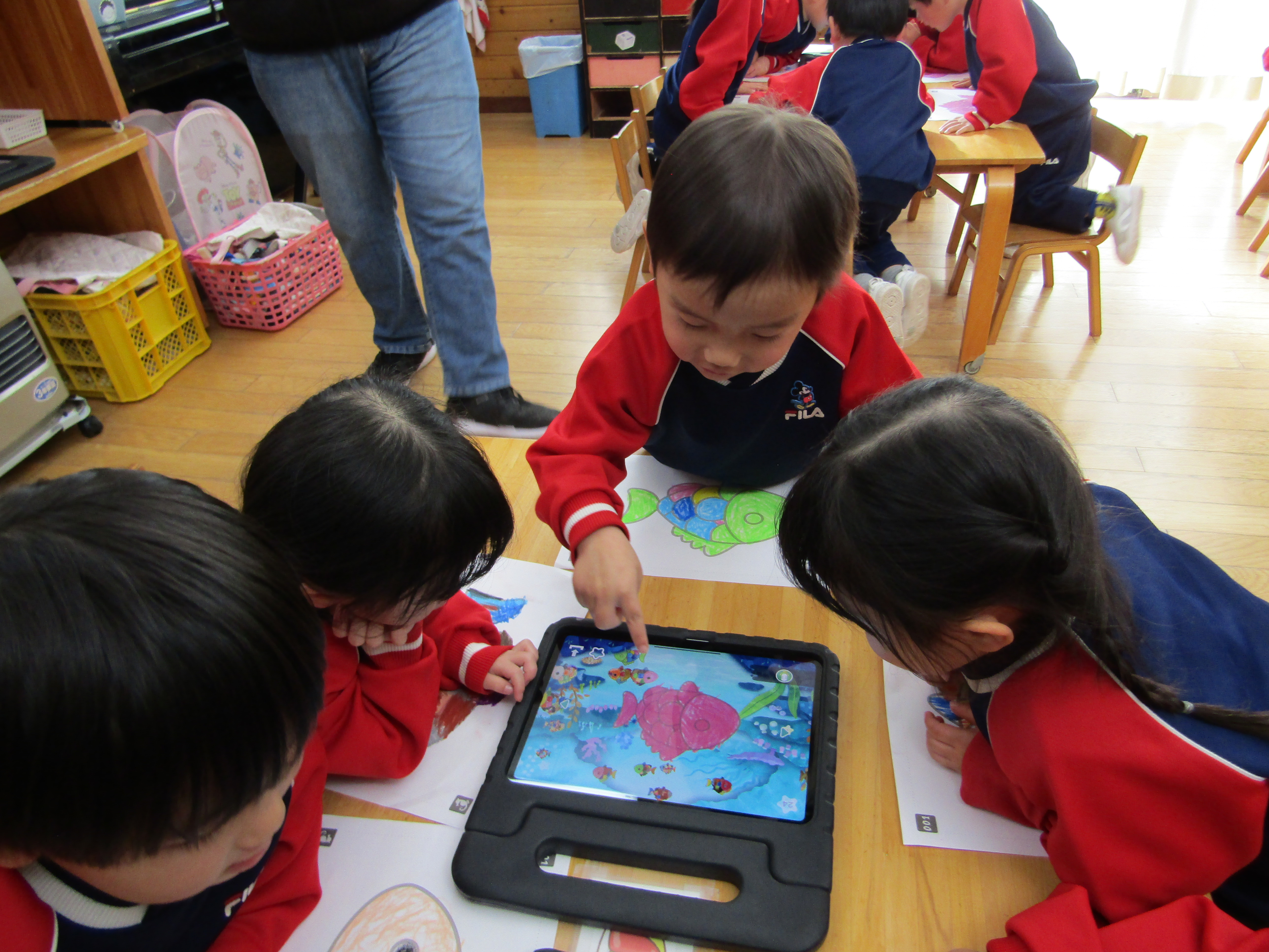 あか組さんも塗った魚をiPadの中へ!