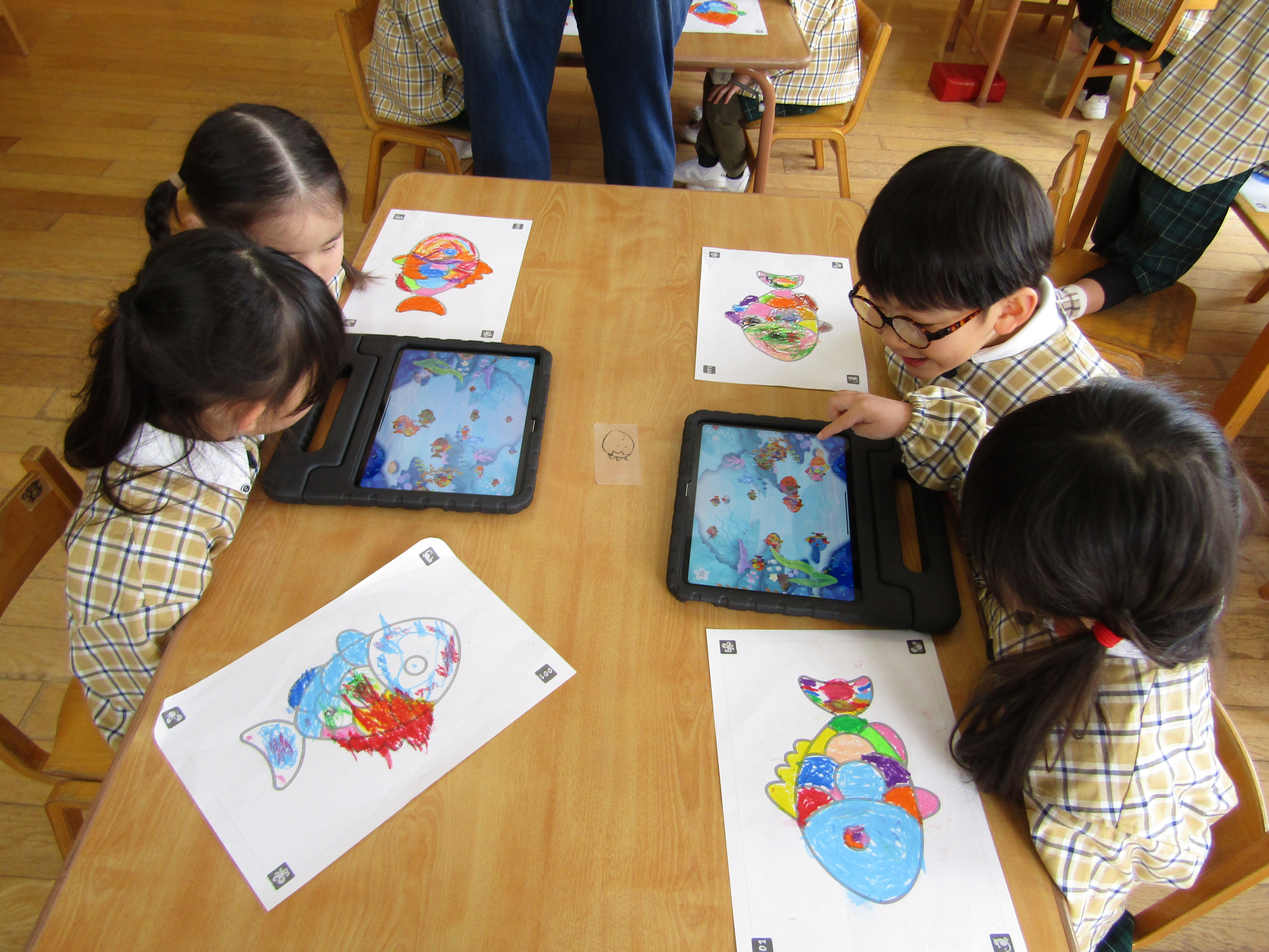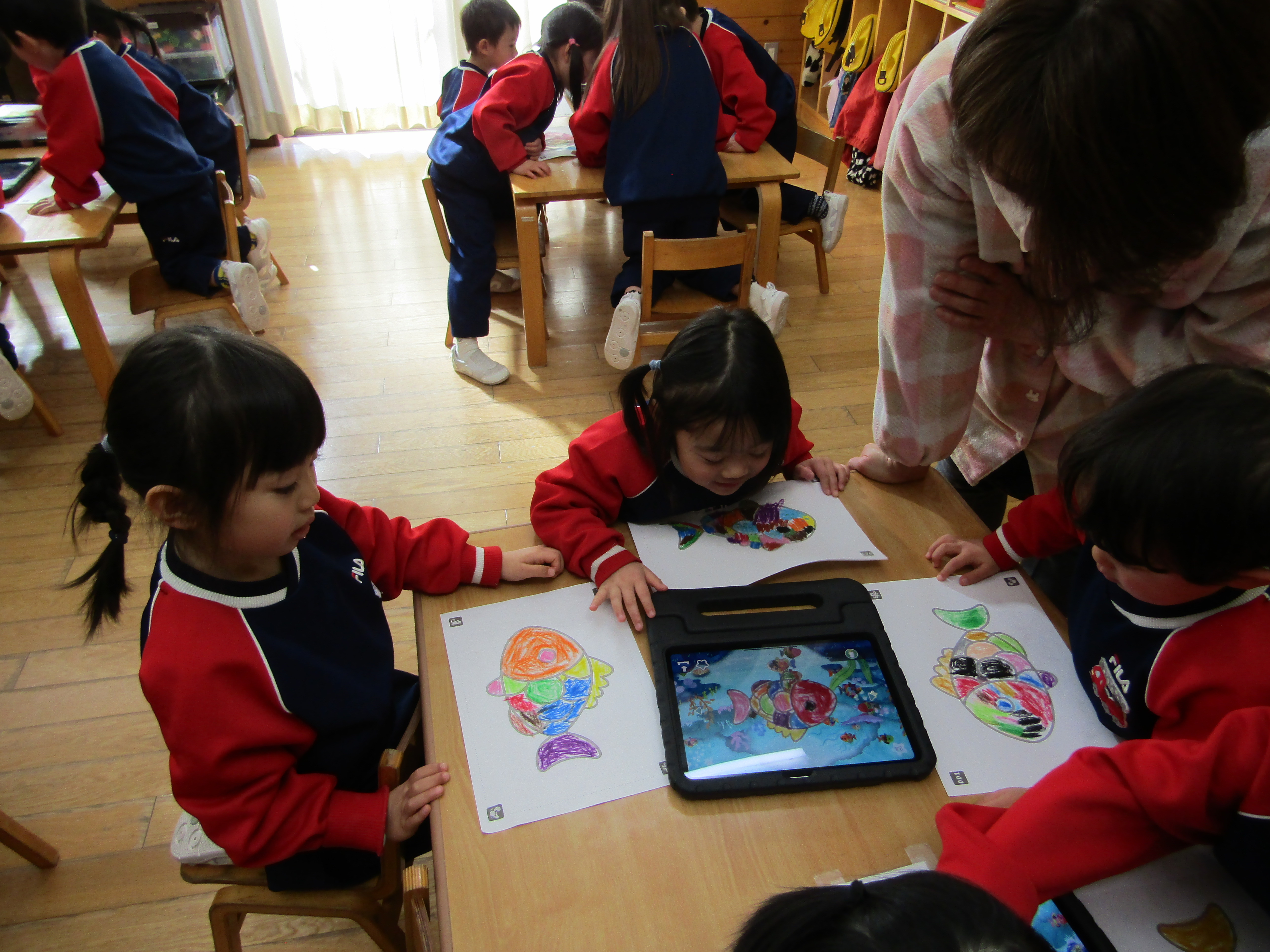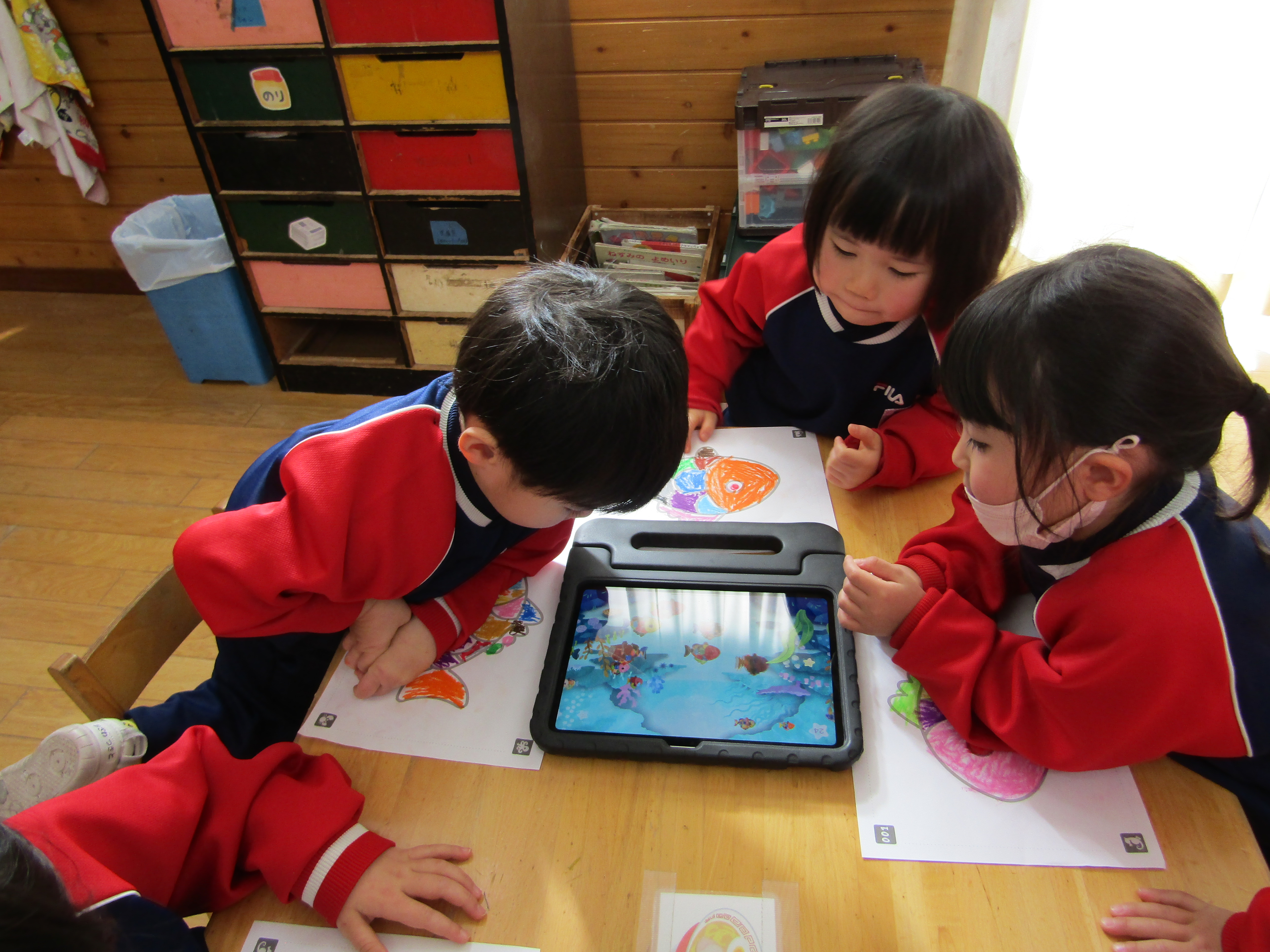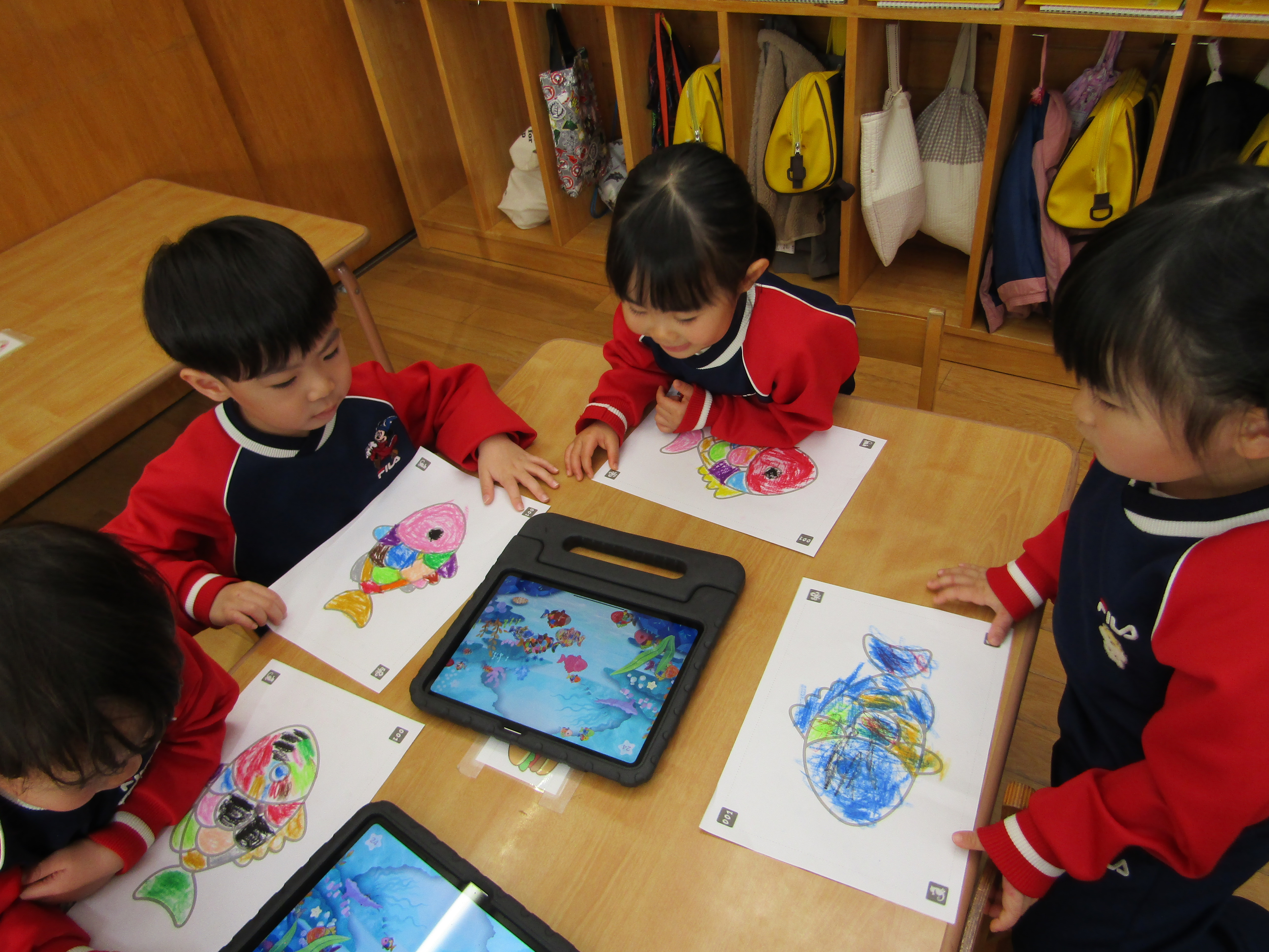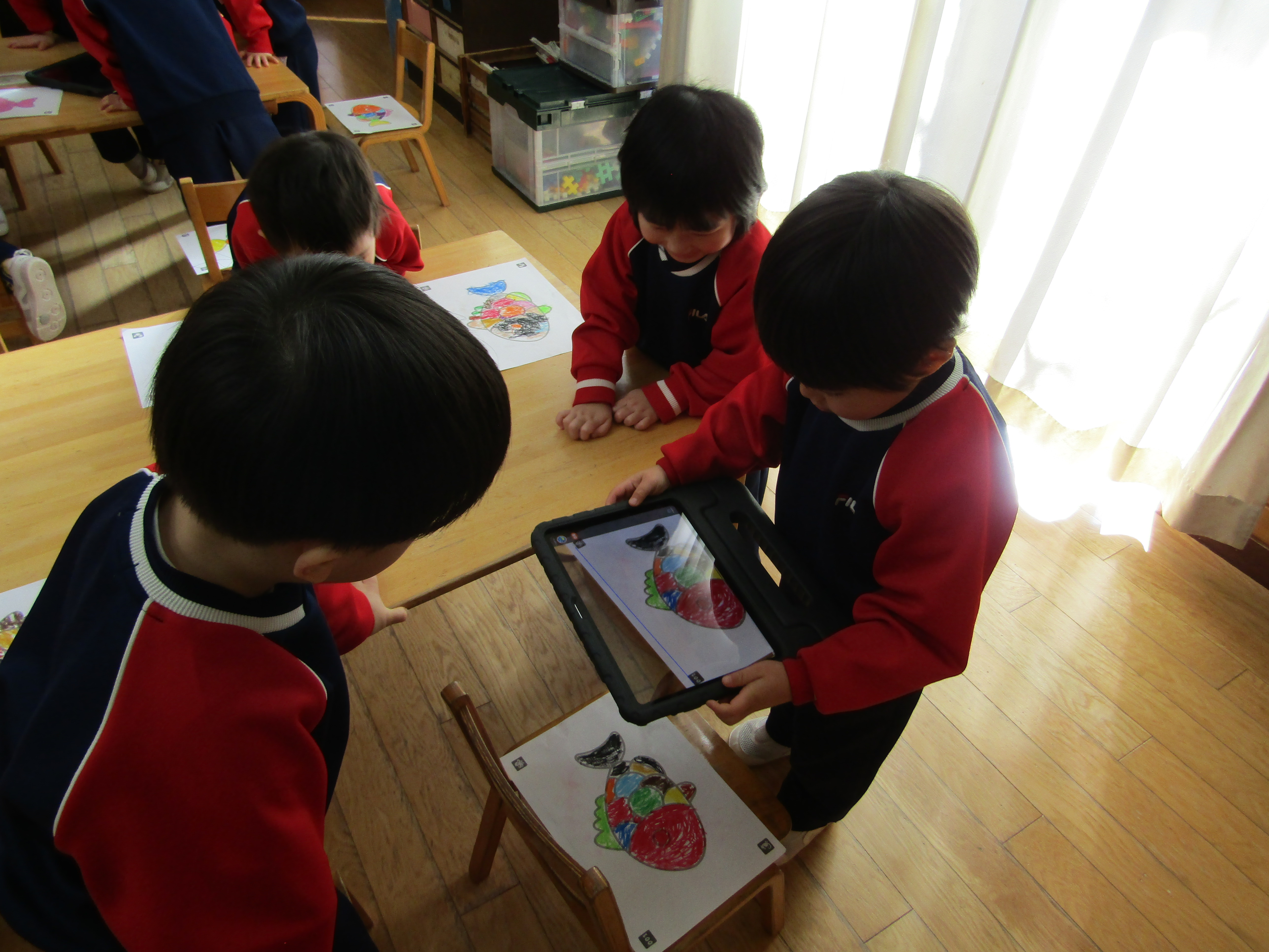 あか組さんも塗った魚をiPadの中へ!