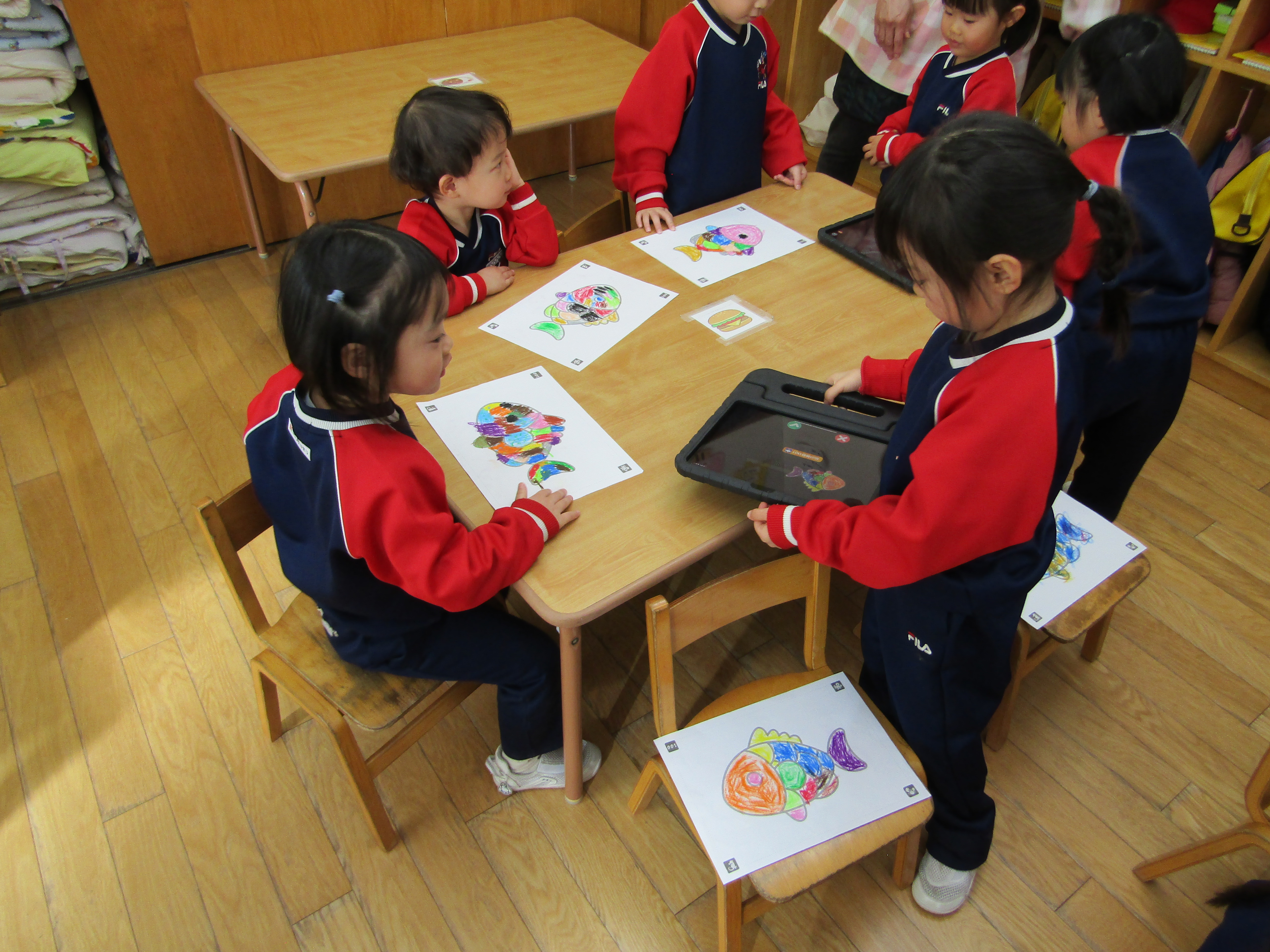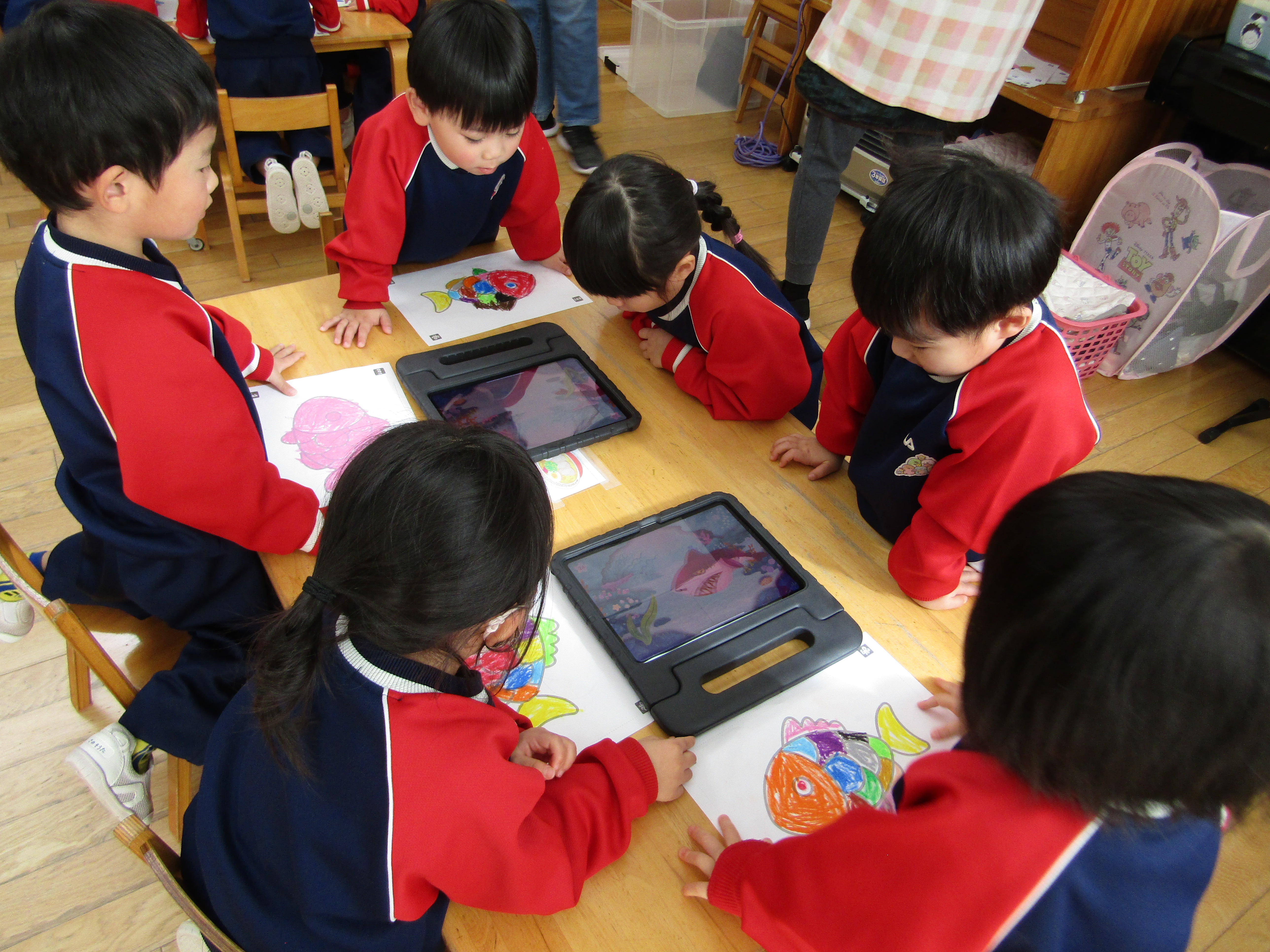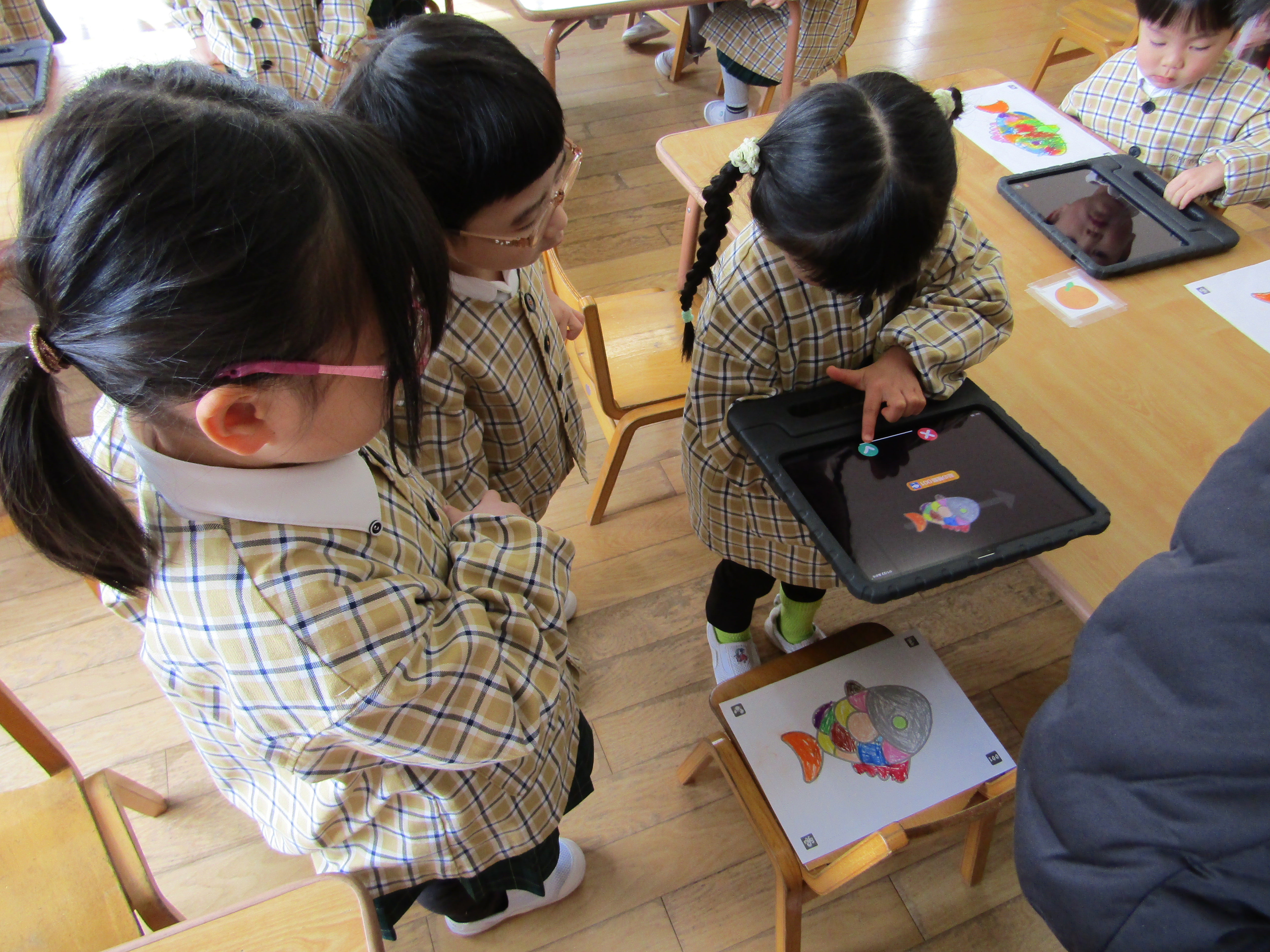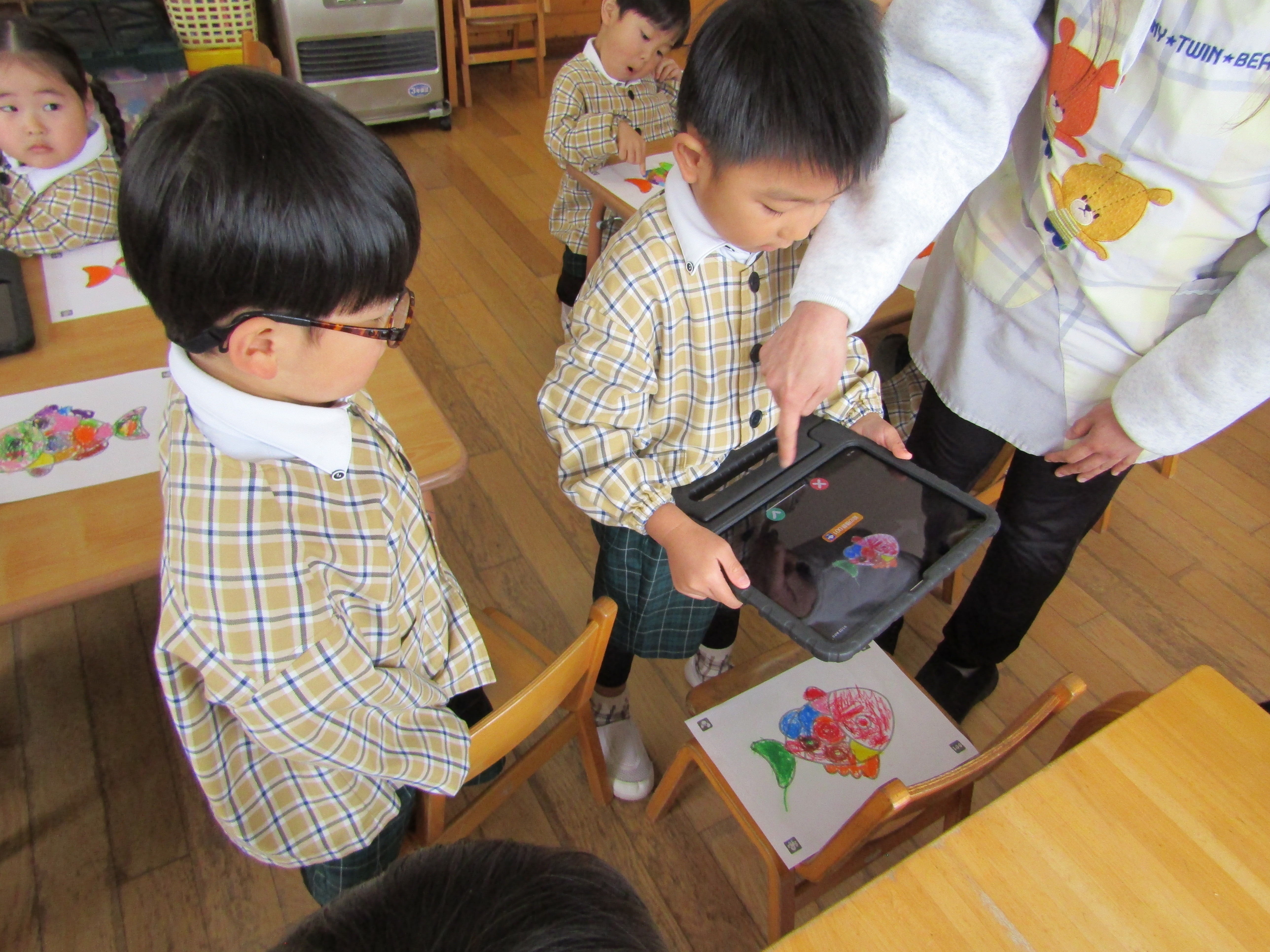 あか組さんも塗った魚をiPadの中へ!