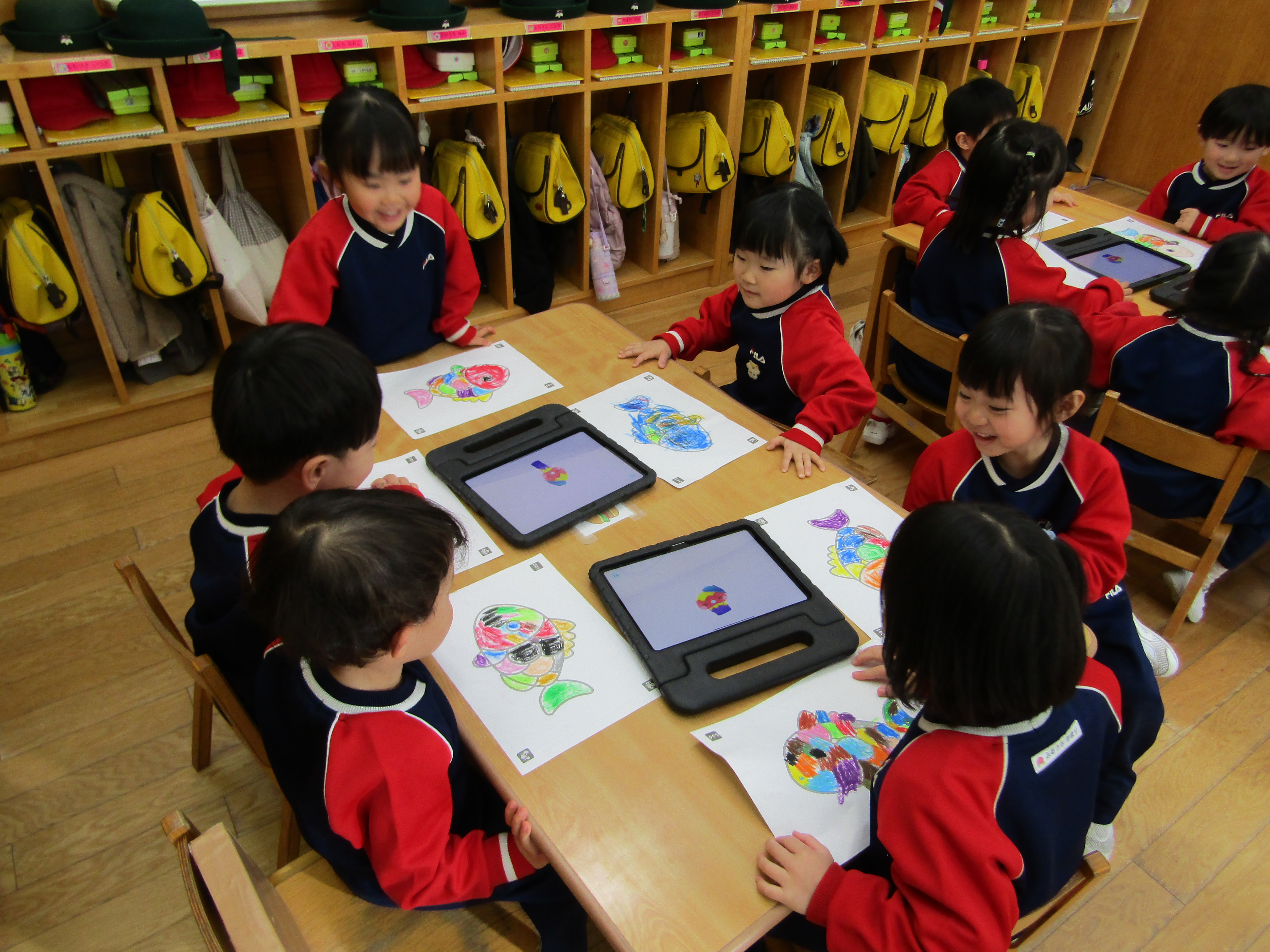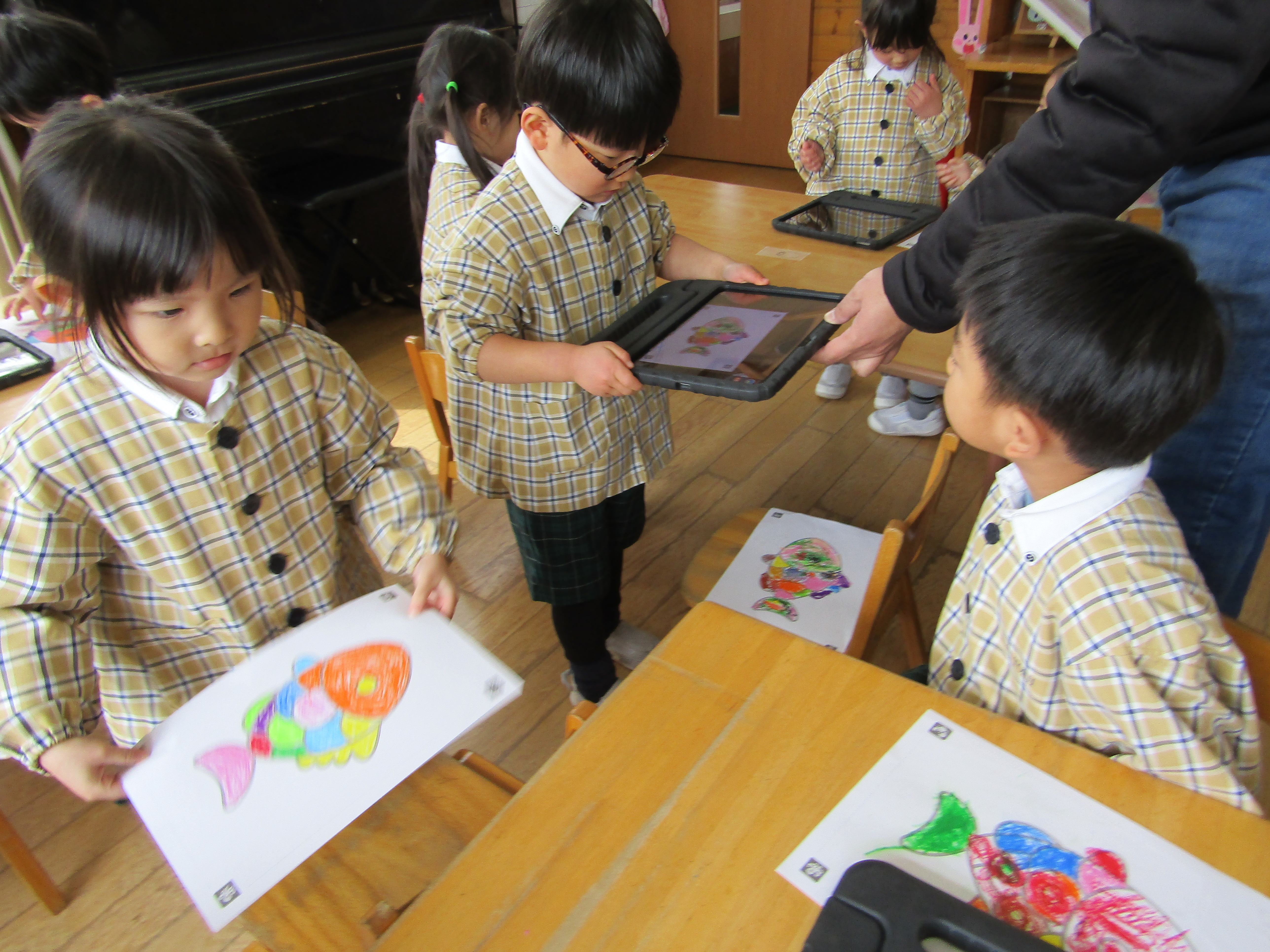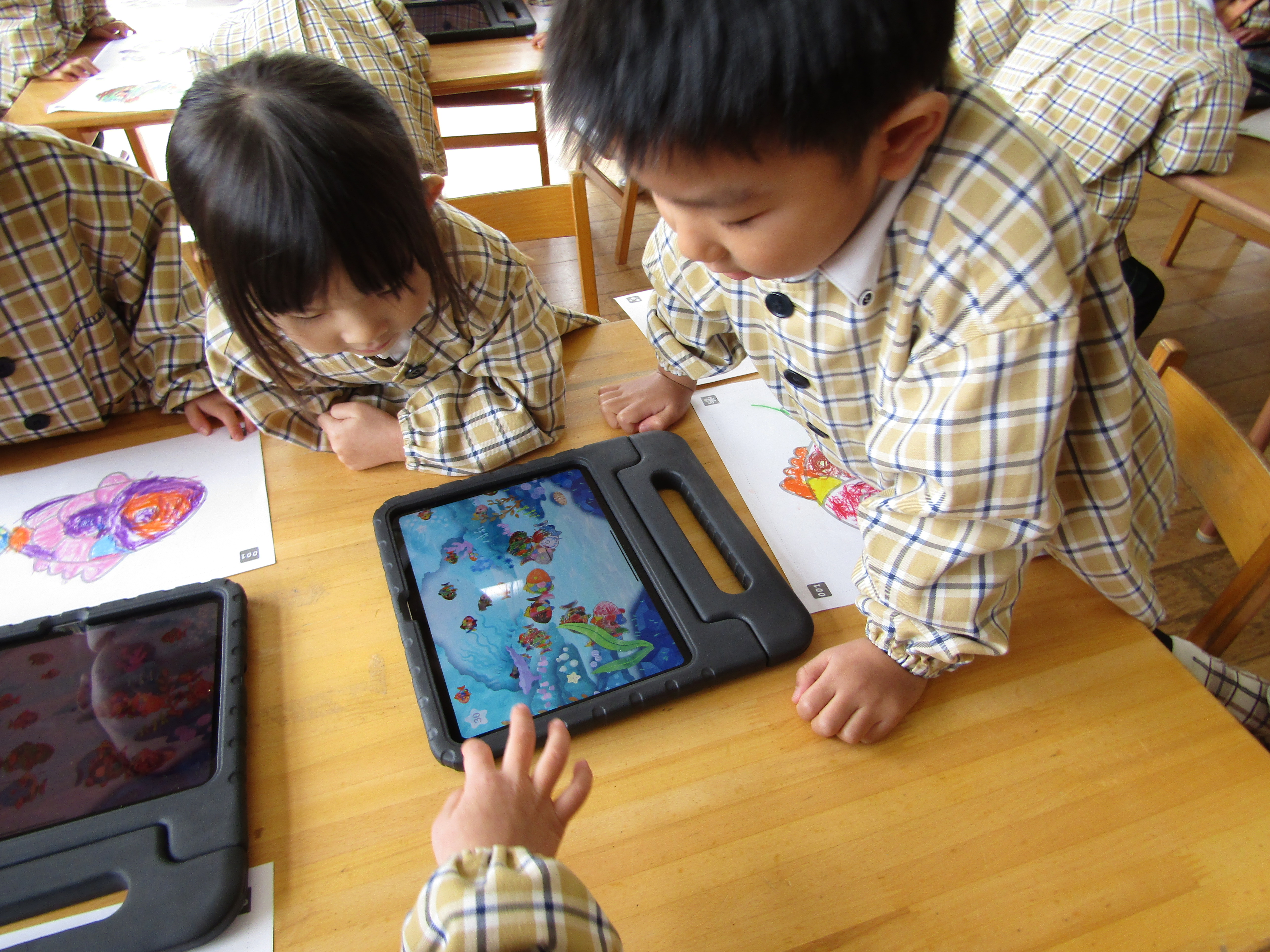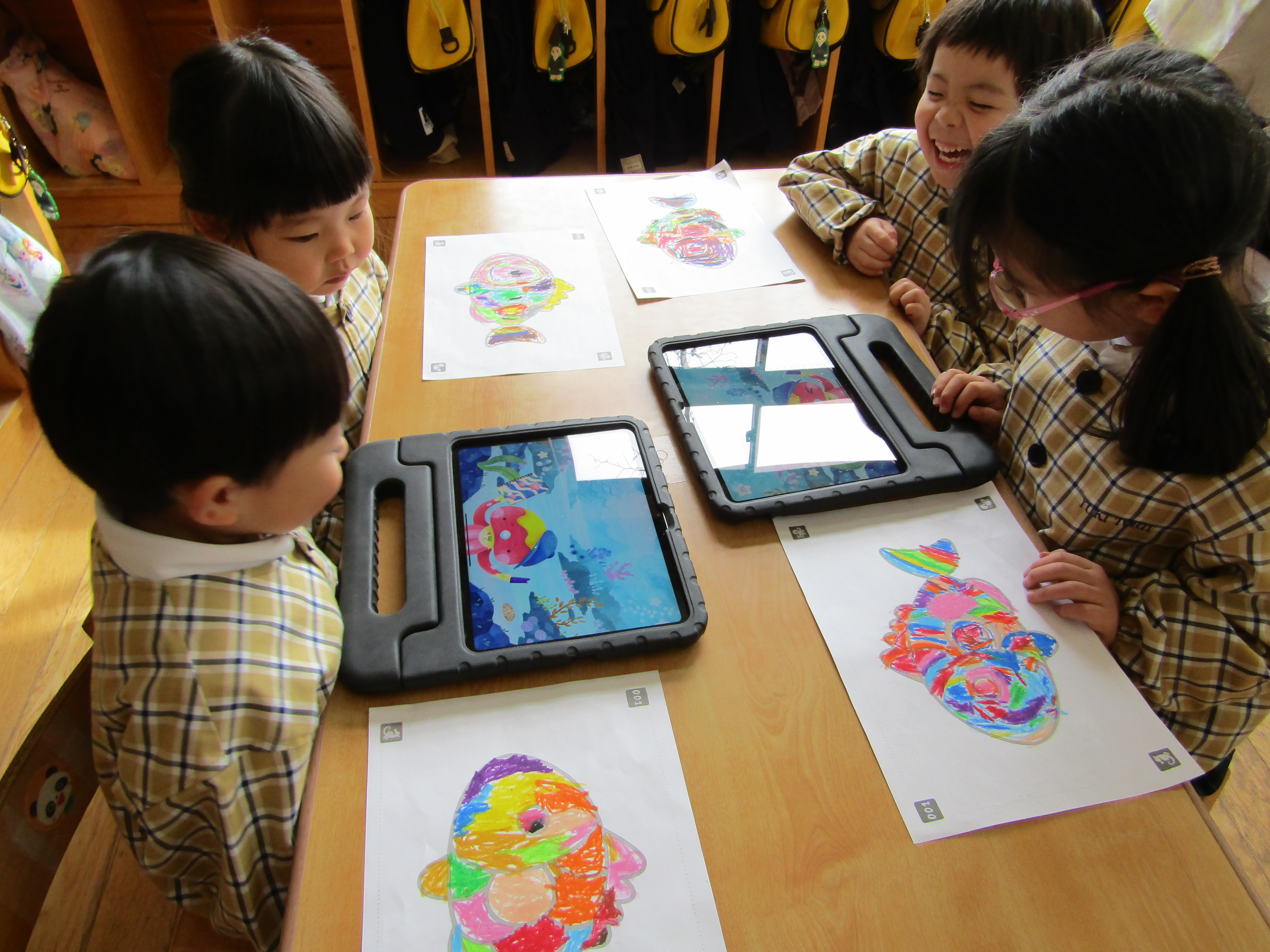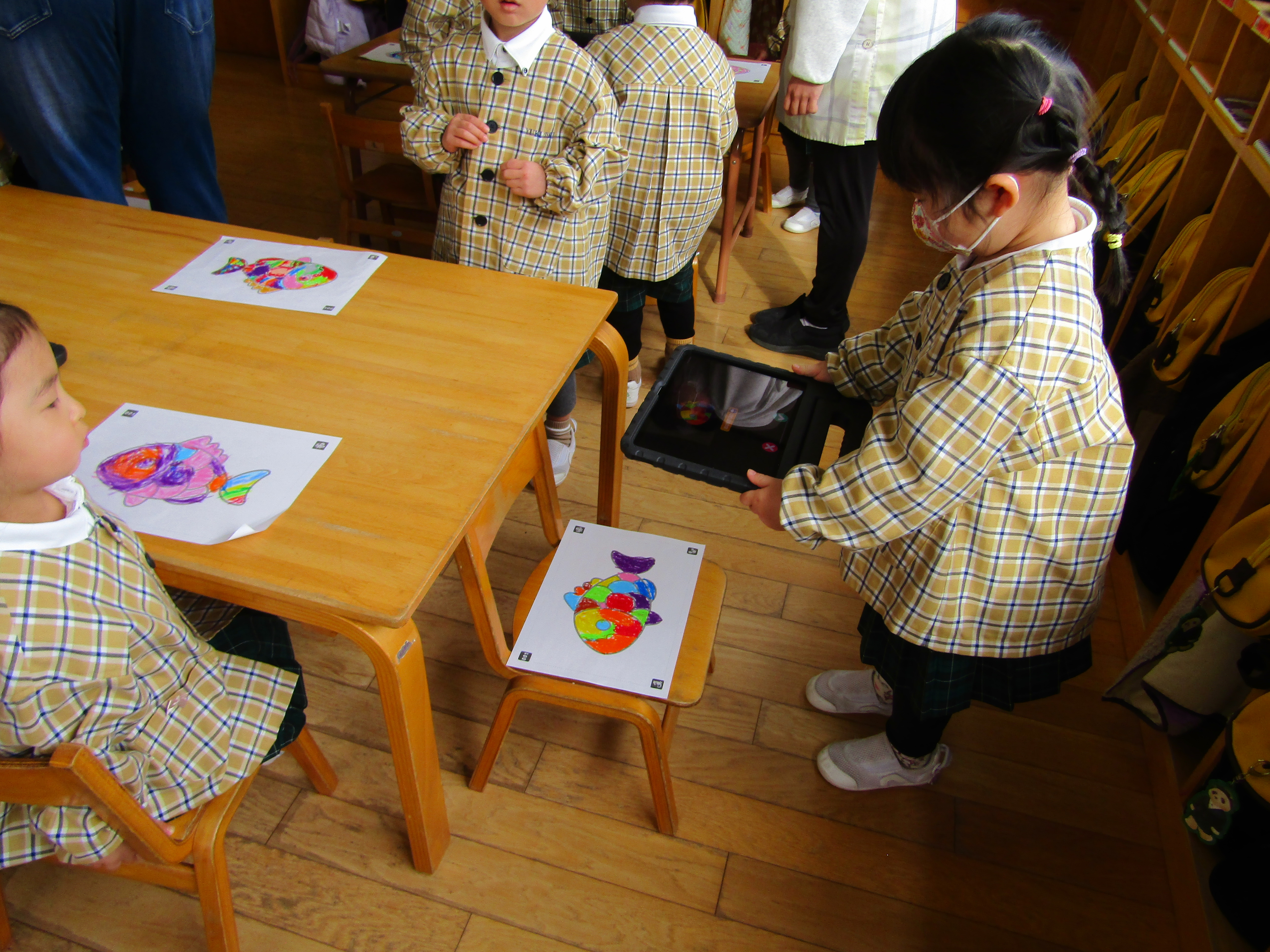あか組さんも塗った魚をiPadの中へ!