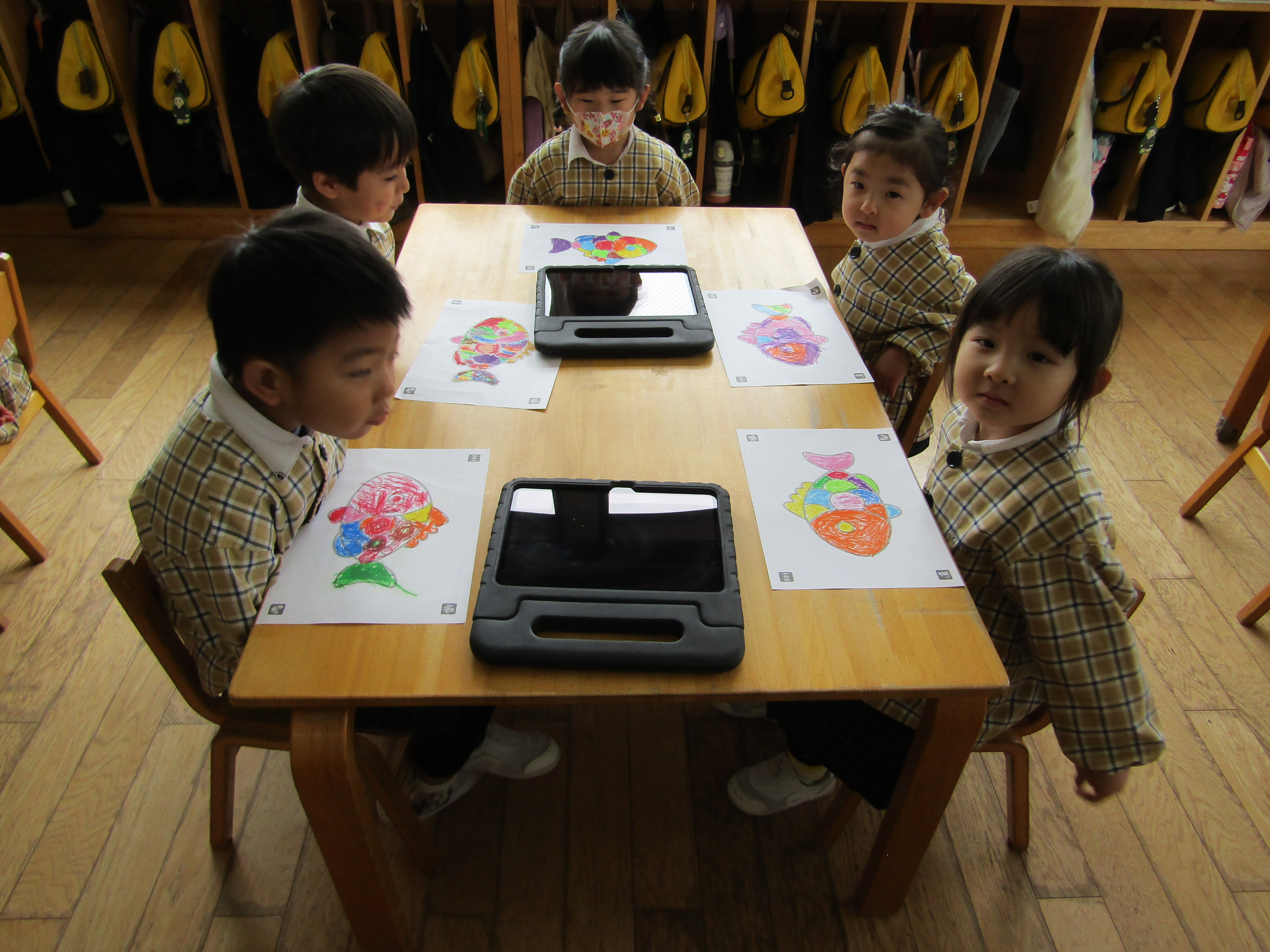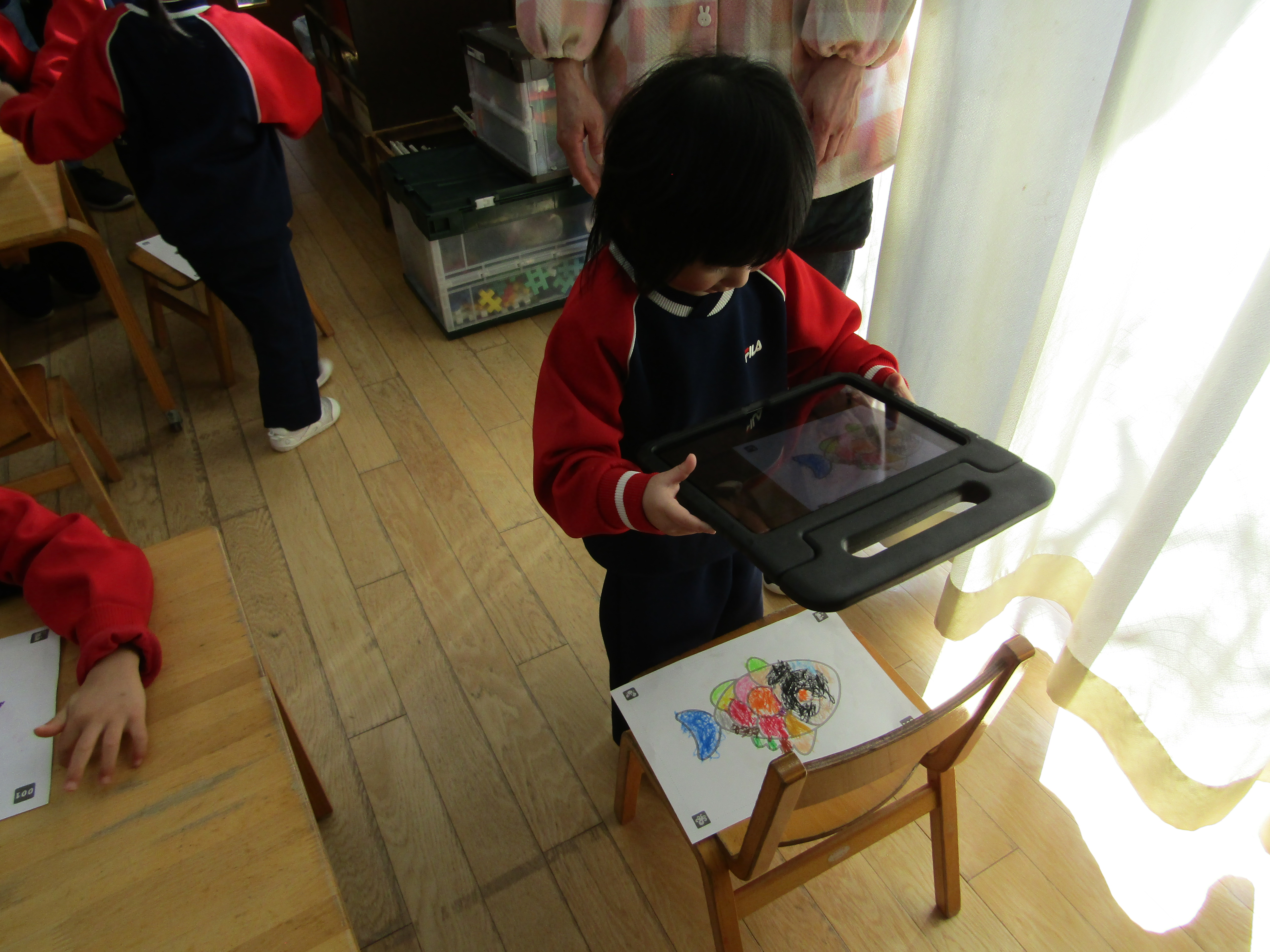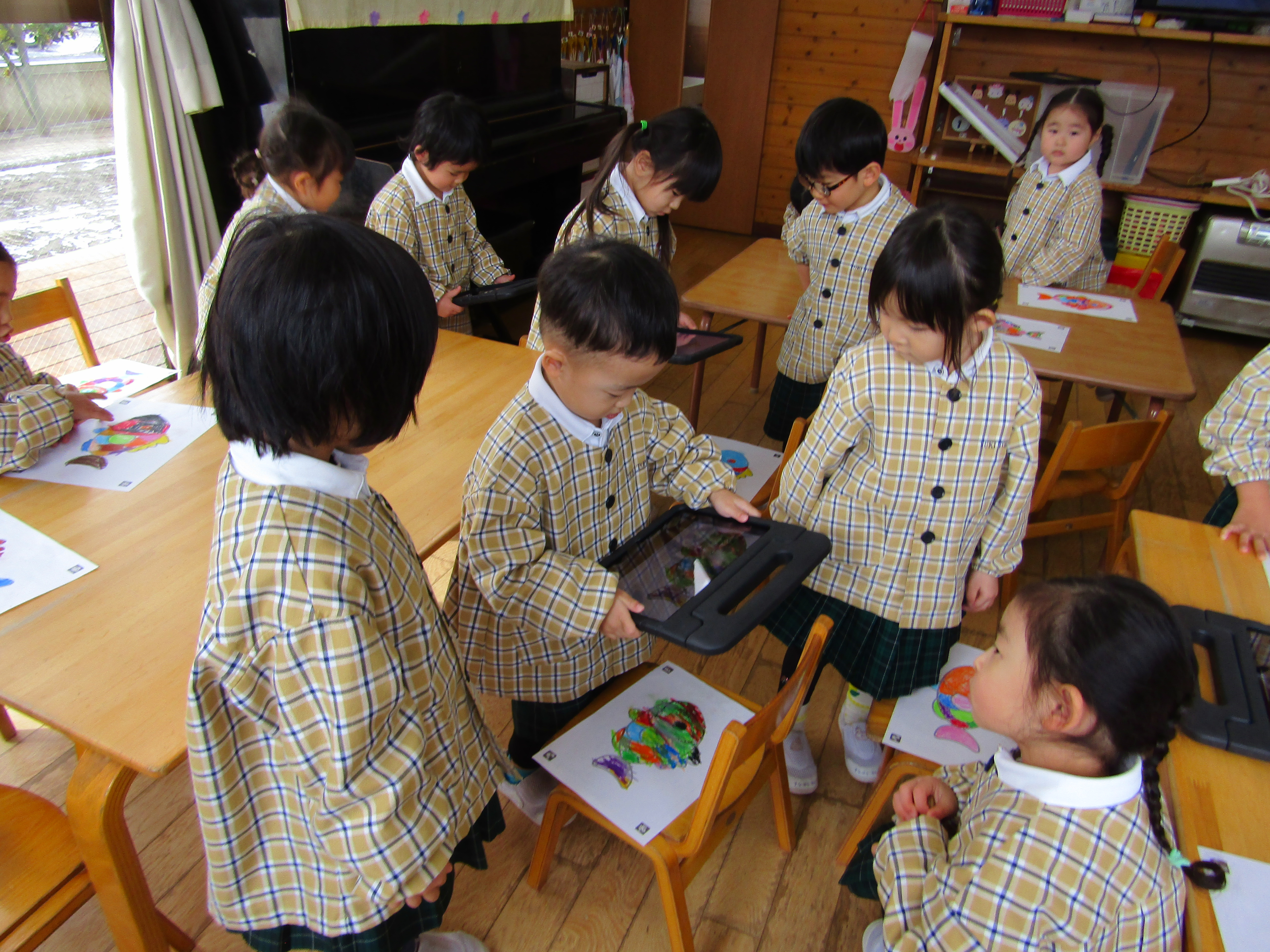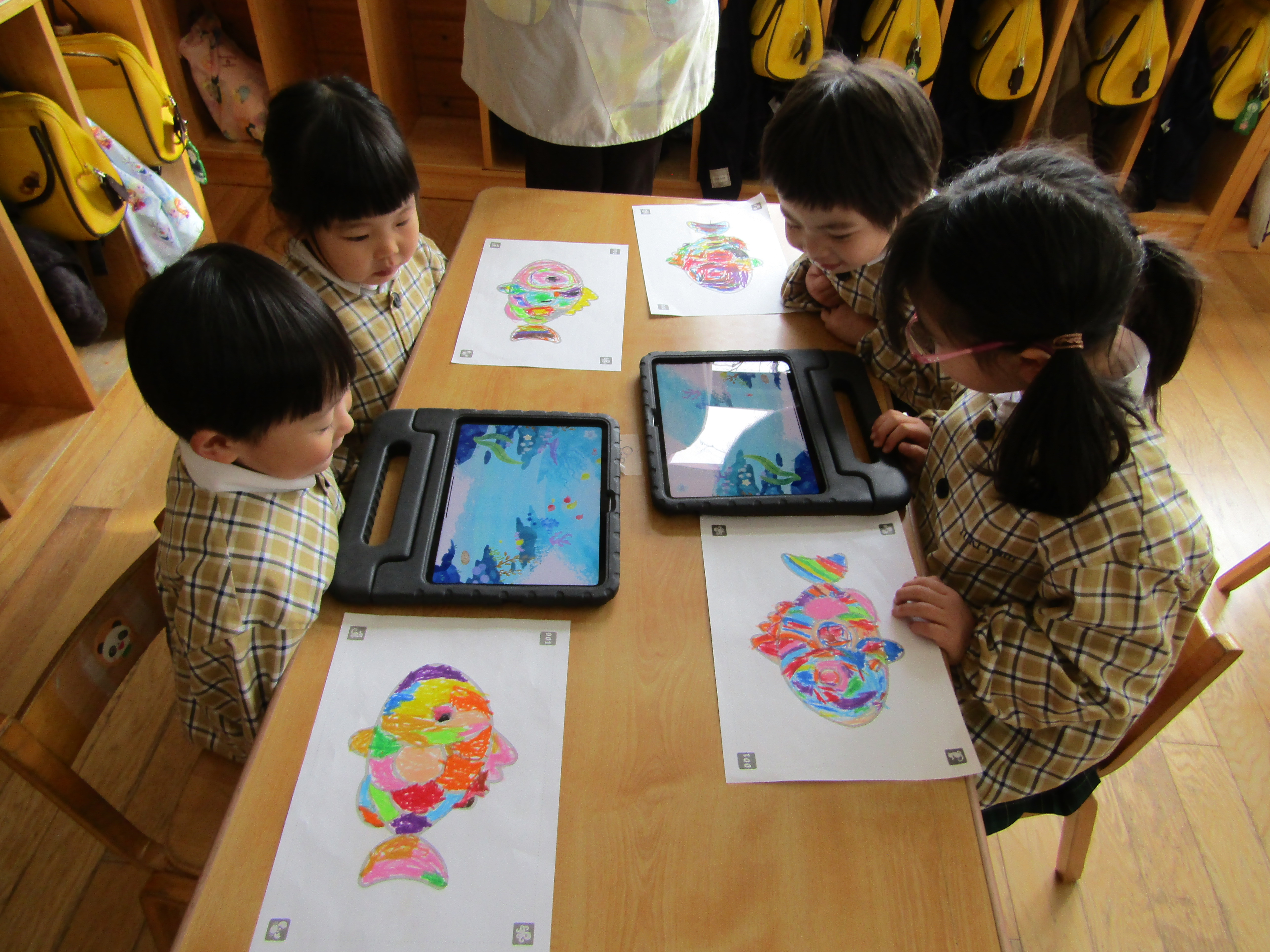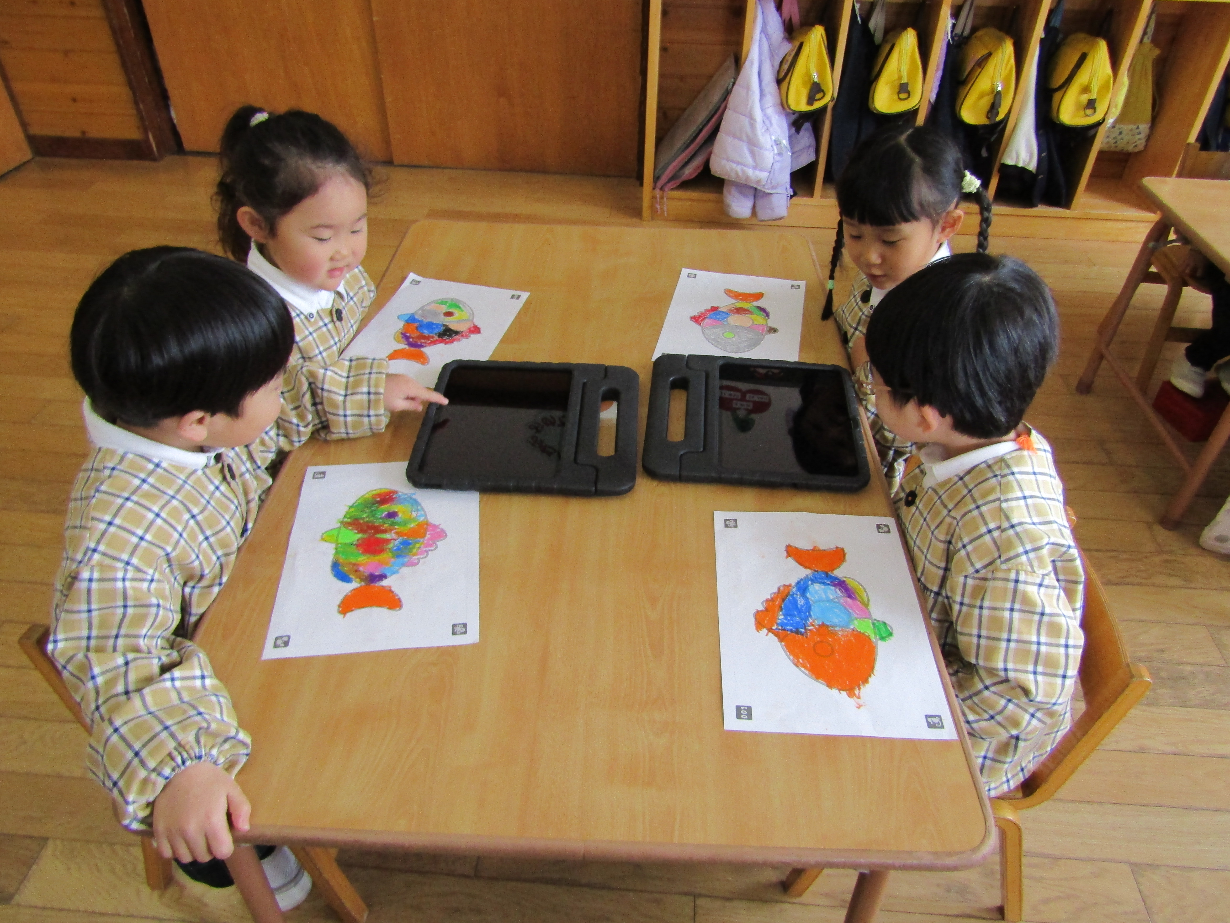 あか組さんも塗った魚をiPadの中へ!