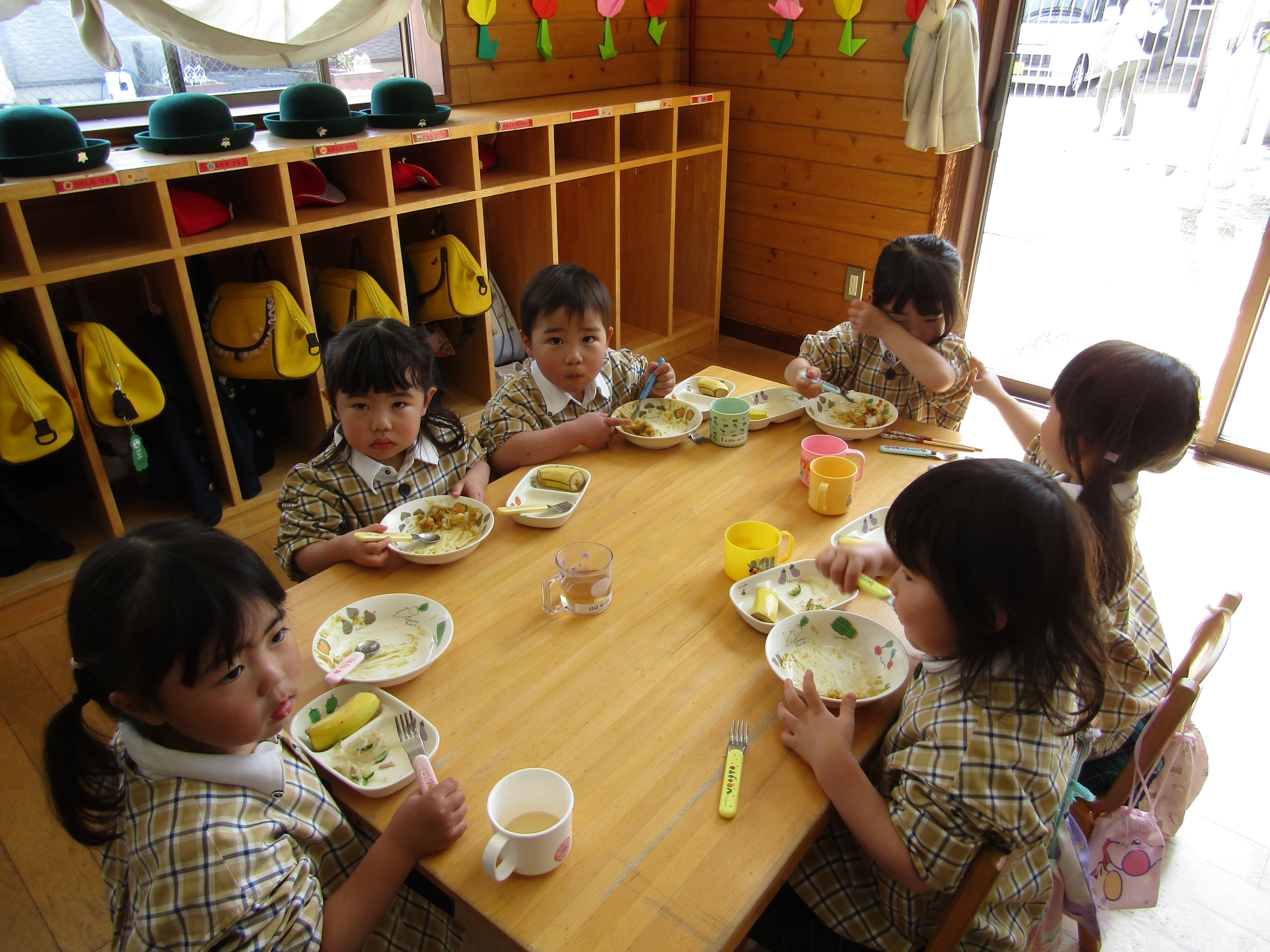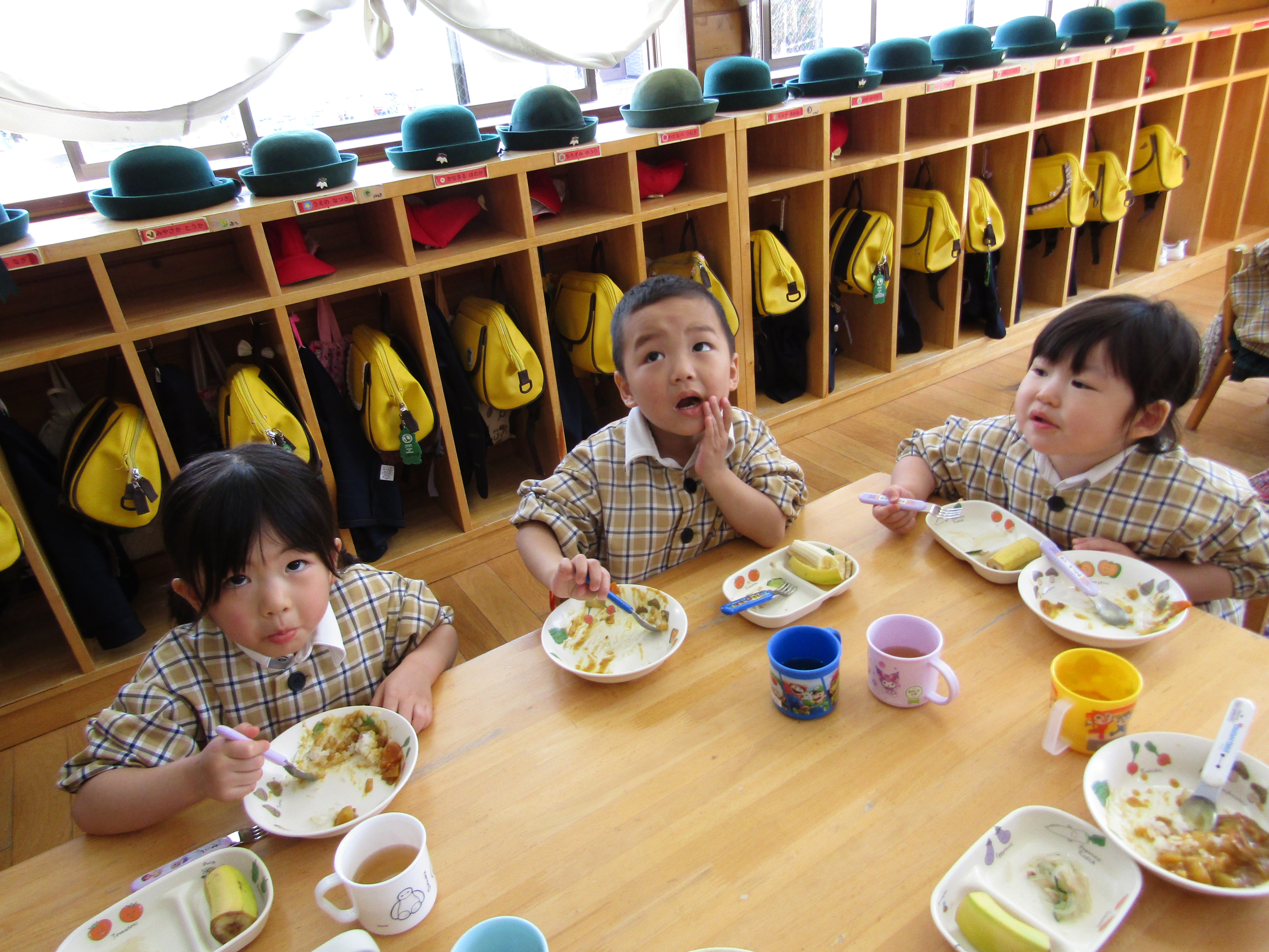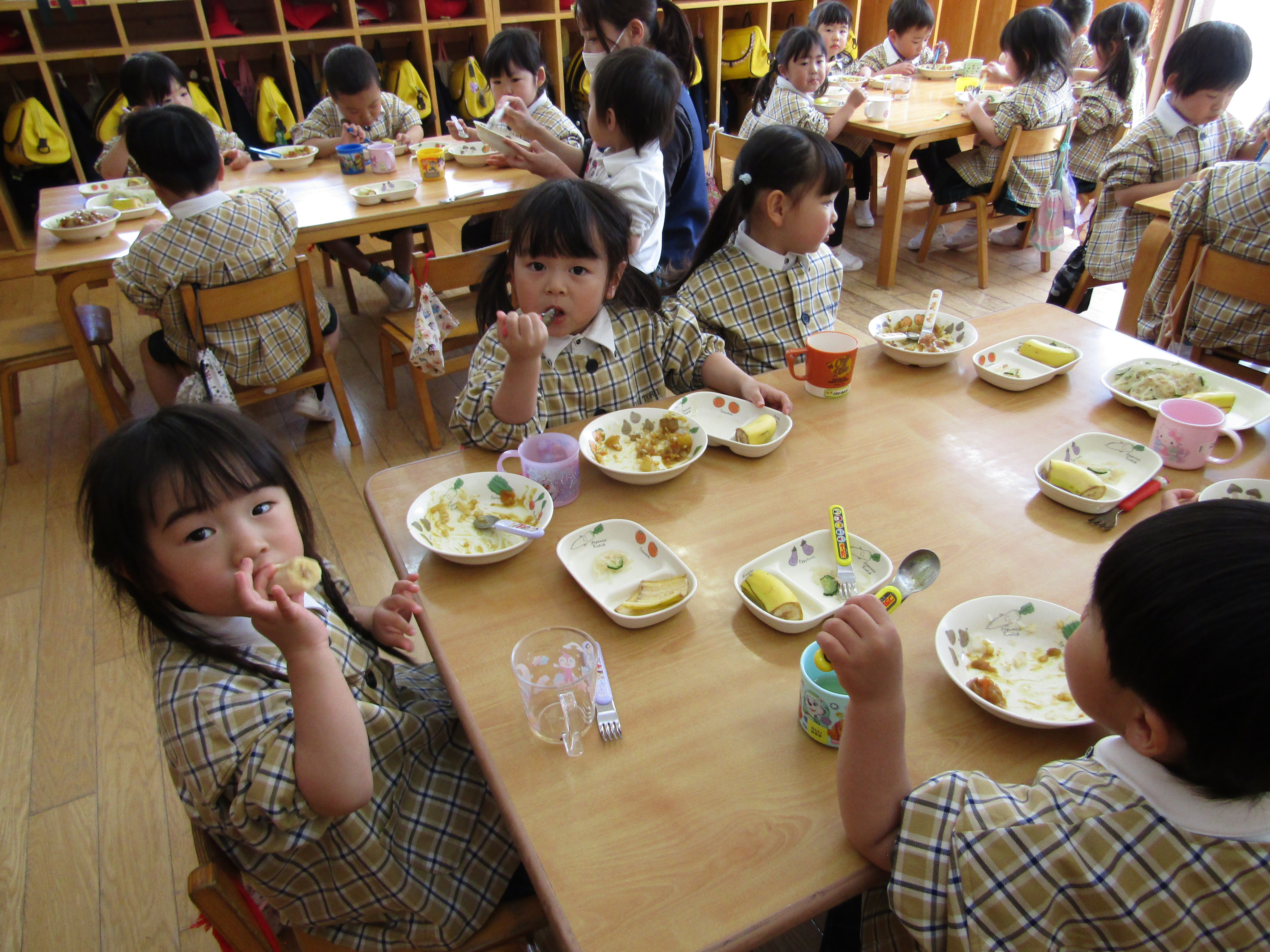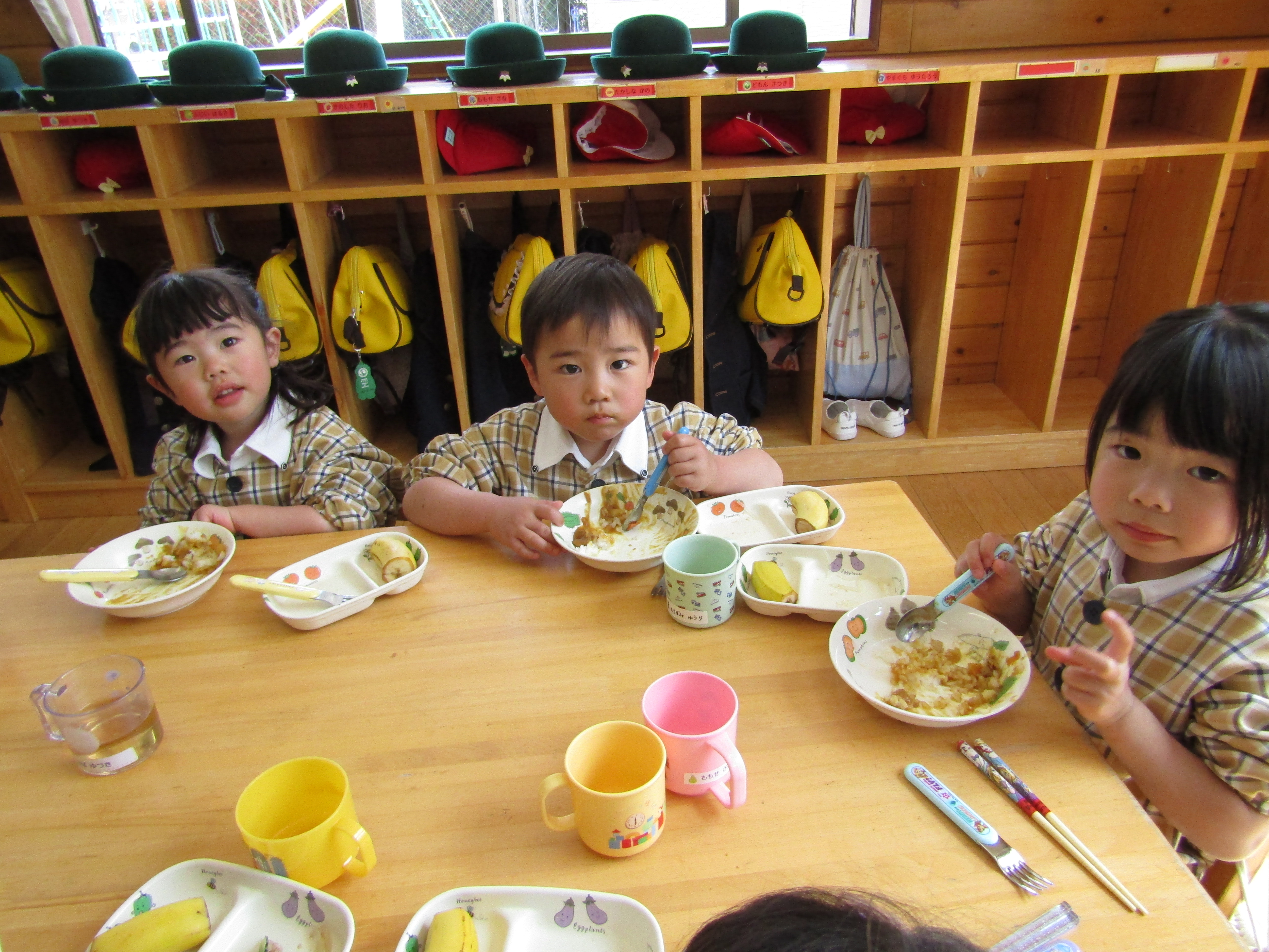 美味しそうに給食を食べるあか組さん!